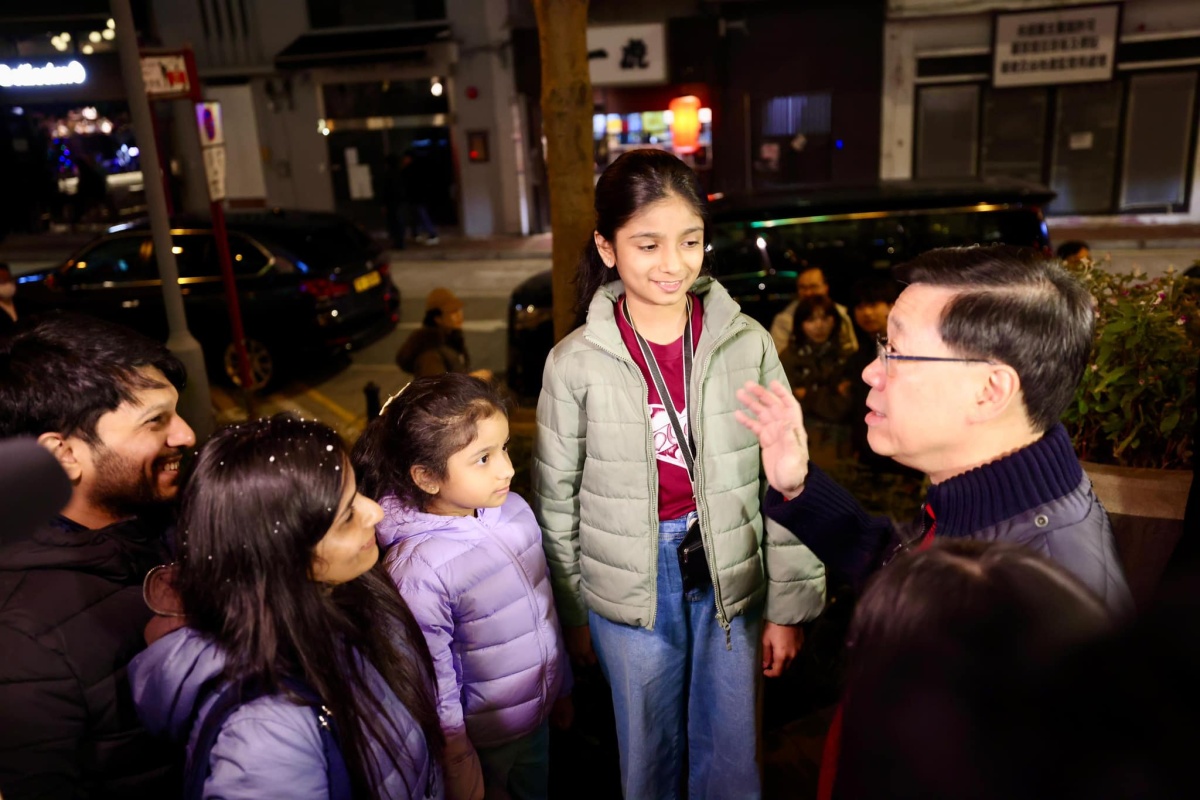 李家超在大館與遊客有講有笑,之後到訪利東街與市民交流。期間他光顧利東街小食店買薯條食,並大讚好味。他亦呼籲市民聖誕期間多些出街及留港消費,以振興本港經濟,又祝福大家聖誕快樂。