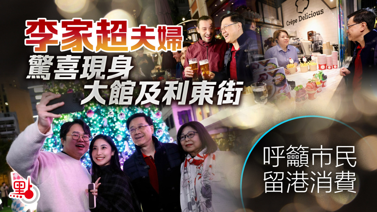 【點新聞報道】行政長官李家超本周到北京述職至昨日(14日)返港,今日(15日)偕夫人林麗嬋驚喜現身中環大館及灣仔利東街,與市民遊客同享聖誕氣氛。