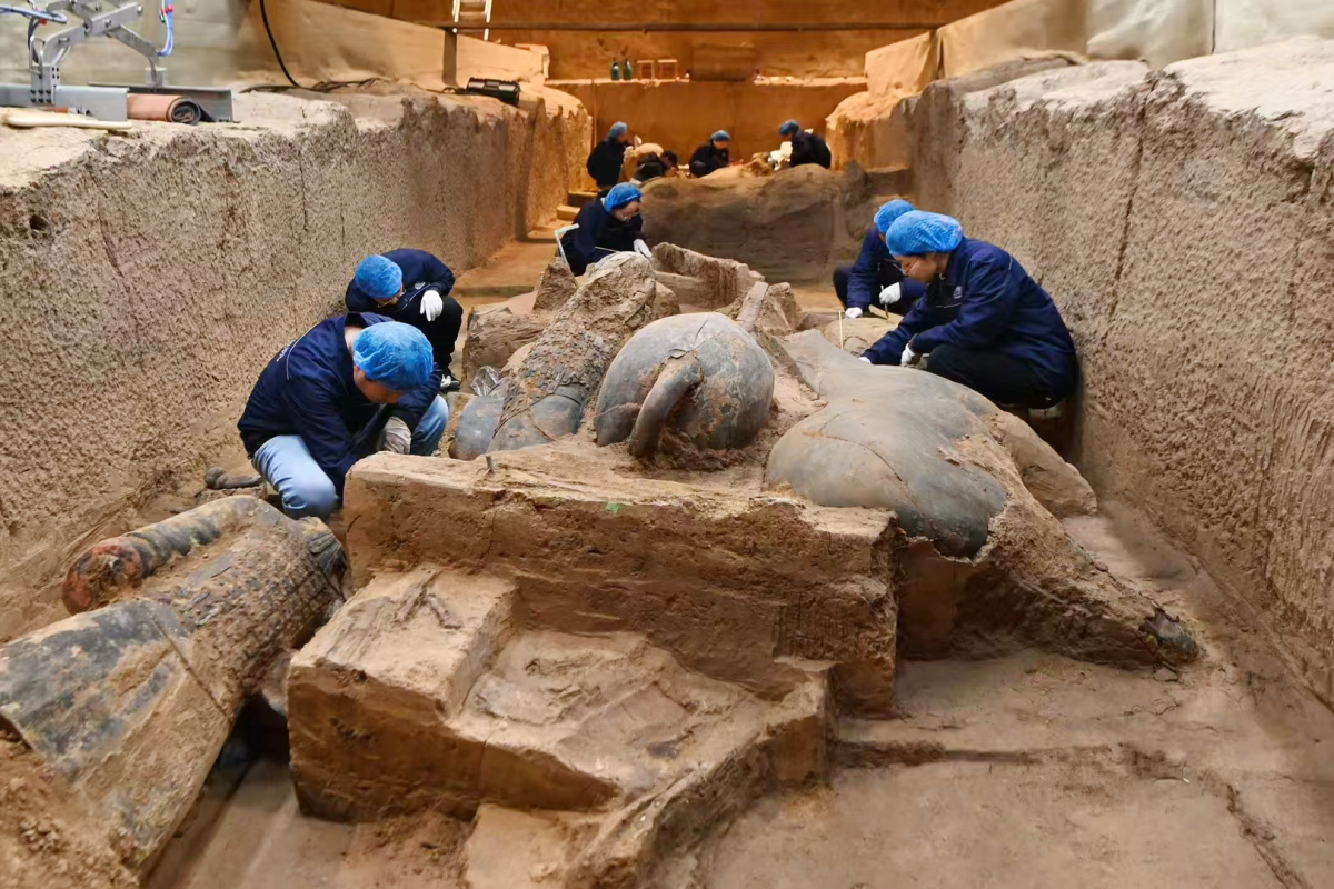 此外,此次發掘中,考古人員還在二號坑發現了兩處戰車遺跡,初步清理出三匹陶馬和三尊陶俑。三尊陶俑中,兩尊為「車右」和「御手」俑,一尊推測為「車左」俑。專家表示,這次發掘對研究秦代的軍事組織和軍事制度,有重要意義。目前,工作人員正在秦兵馬俑二號坑實驗艙對這尊新發掘的高級軍吏俑進行深度清理和初步拼接。