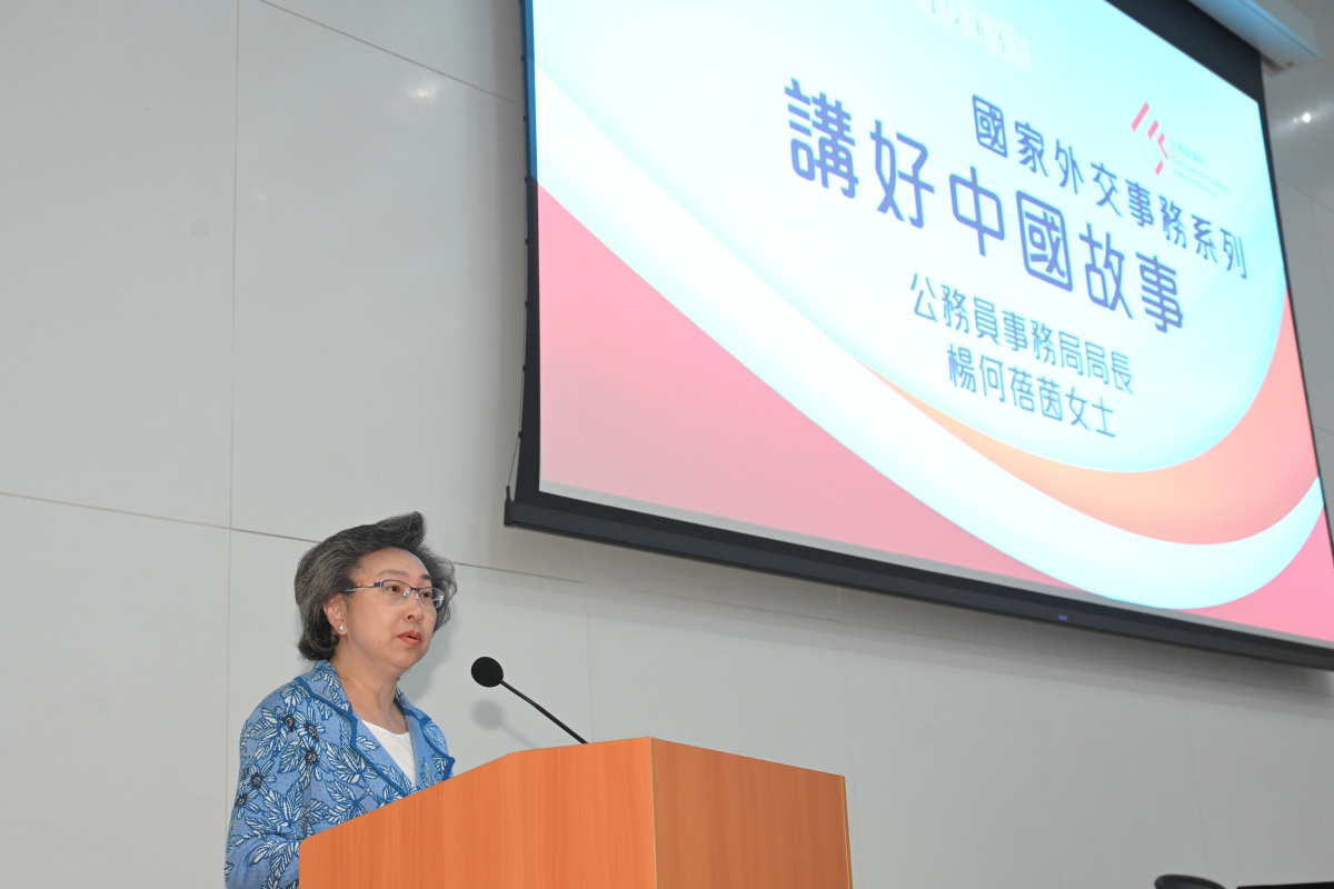 公務員事務局局長楊何蓓茵在講座致辭時表示,香港在「一國兩制」下擁有「背靠祖國、聯通世界」的獨特優勢,不僅可以直接參與內地的龐大市場,更是連接內地與世界的重要橋樑,是一個充滿機遇的國際城市。當中,香港擁有無數值得講述與祖國聯繫、與國際聯通的成功故事。香港特區公務員作為政府有效施政的關鍵,更應該配合特區政府,凝聚社會力量,共同向全世界宣揚香港的優勢、成就和機遇,從而向國際社會講好「一國兩制」成功實踐的中國故事。
