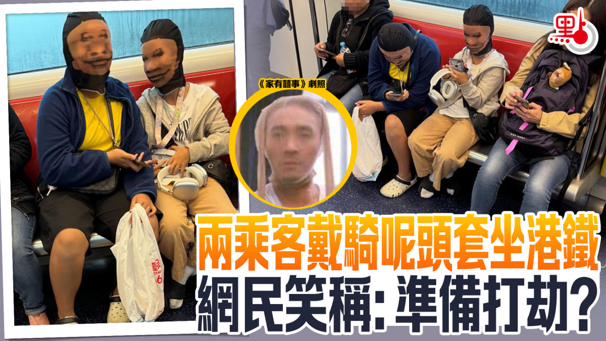 【點新聞報道】頭套造型層出不窮,日前有網民在社交平台分享照片,指在港鐵車廂見到有兩名乘客疑「玩膠」,一同戴上騎呢頭套。照片後放到網上惹起熱議,「準備打劫?」、「自己不尷尬系列」、「笑死」。