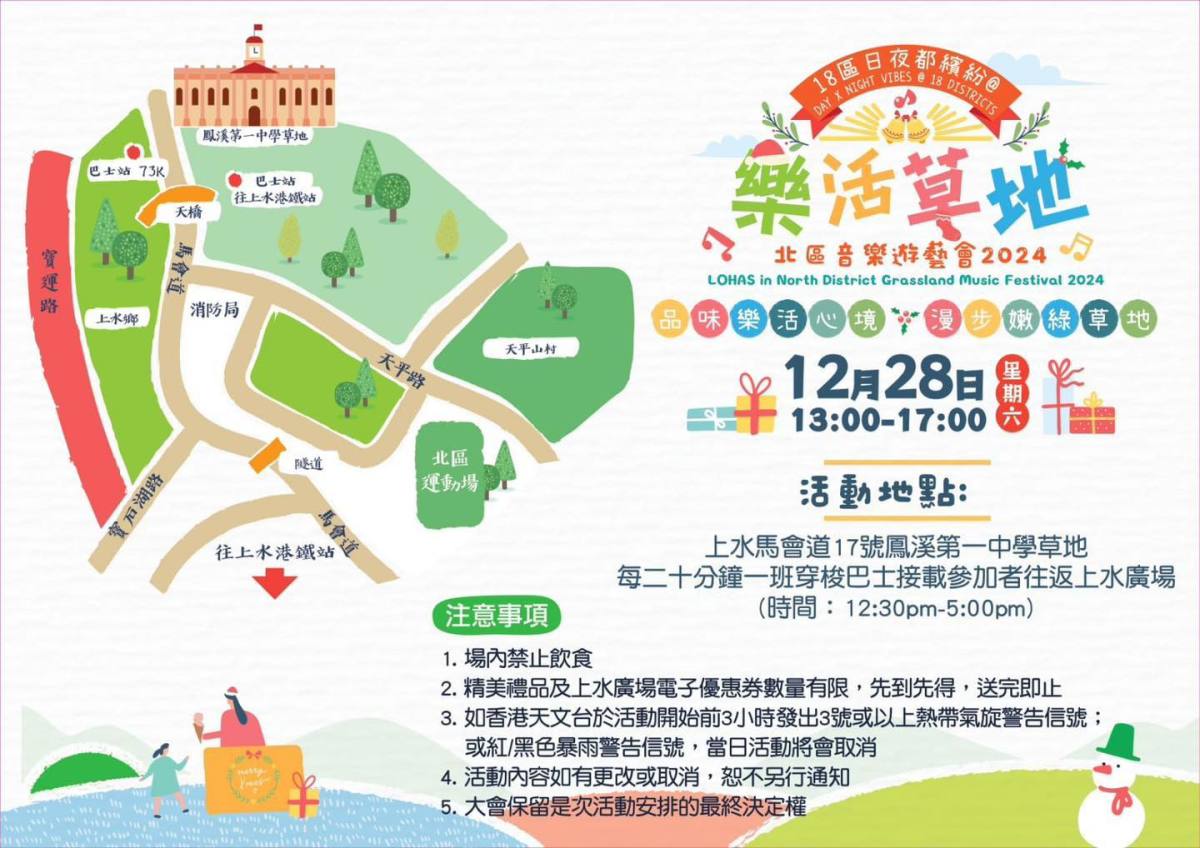 交通:免費穿梭巴士在下午12時30分至下午5時30分往返上水廣場及樂活草地(上水巴士總站近N42A及NA43巴士路線位置)