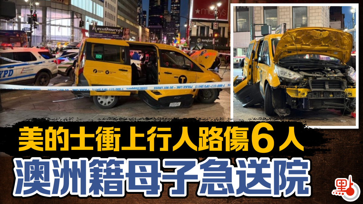 【點新聞報道】美國紐約市一輛的士周三(12月25日)衝上行人路,撞倒多名路人,連司機在內合共7人受傷,包括一對澳洲籍母子。暫未清楚造成事故的原因,據報司機當時可能出現健康問題,當局正展開調查。