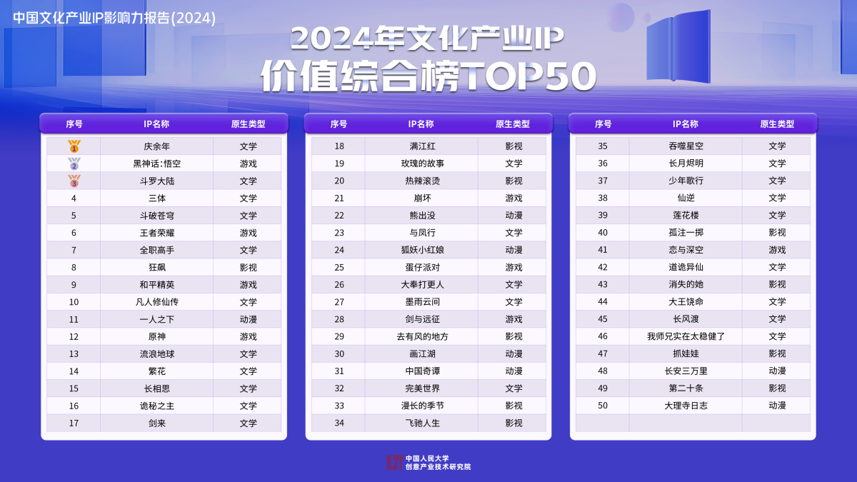《報告》設置了IP價值綜合指數,選取2023年1月至2024年9月有過小說、動漫、影視、遊戲、實體線下衍生等形態的創作或改編,新發布或仍提供更新、下載等服務的前100名中國當代IP,從IP感知力、傳播力、開發力、拓展力四個維度構建綜合評價體系,最終公布了前50大IP構成「2024年文化產業IP價值綜合榜TOP50」(以下簡稱「TOP50 IP」),《慶餘年》《黑神話:悟空》《鬥羅大陸》《三體》和《鬥破蒼穹》位列前五。