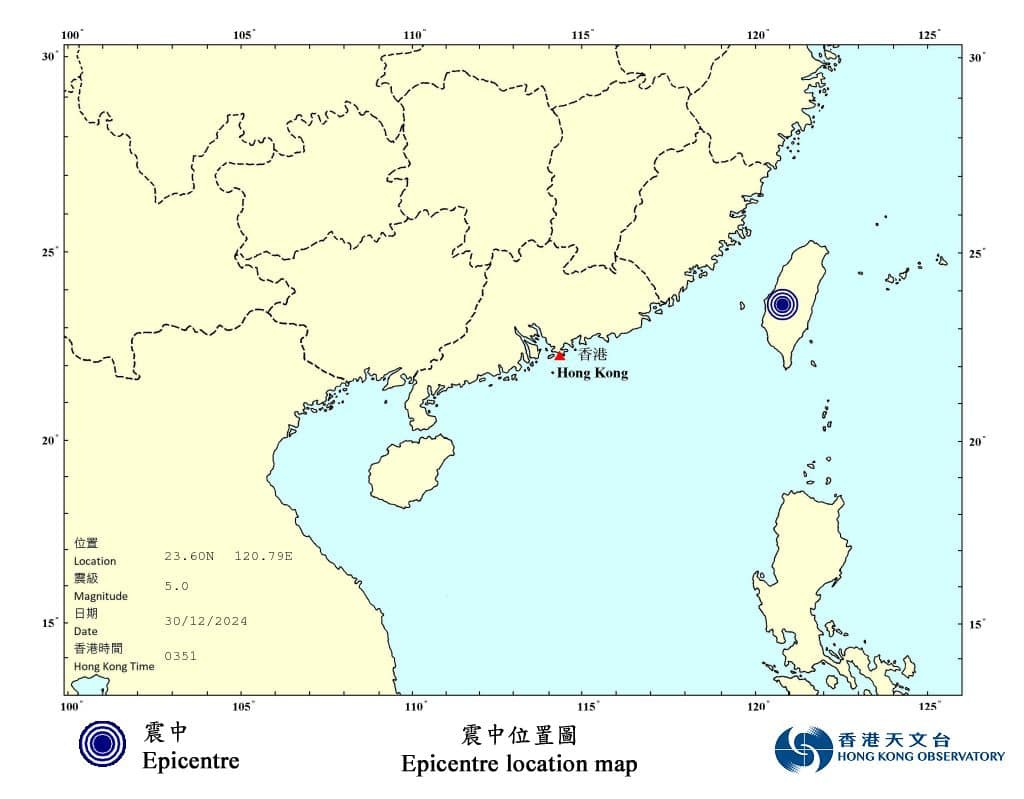 【點新聞報道】台灣嘉義縣今日(30日)凌晨發生地震,本港亦有震感。台灣氣象部門公布,此次地震規模達到5.1級,地震深度12.3公里,震央位於嘉義縣梅山鄉。據香港天文台初步測算,今日上午3時51分在台灣發生一次5.0級地震,震中位於嘉義之東北偏東約44公里,震源深度約5公里。