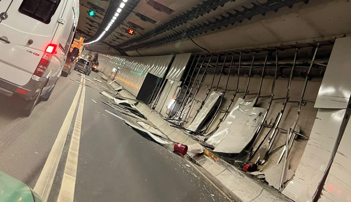 【點新聞報道】屯赤隧道的牆板今日(30日)遭掃毀。下午5時許,屯赤隧道職員發現隧道內約20米金屬護牆板遭掃毀,疑為吊臂車失控,未收妥吊臂導致。職員已經報警,現場交通受事件影響而擠塞。