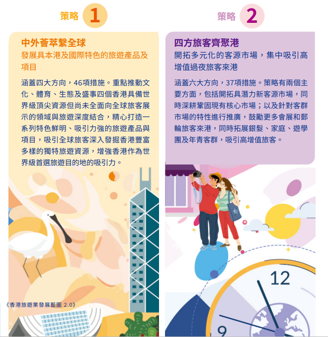 涵蓋37項措施。策略採取兩個主要方面,包括開拓具潛力客源市場,同時深耕鞏固現有核心市場;以及針對客群市場的特性進行推廣,鼓勵更多會展和郵輪旅客來港,同時拓展銀髮、家庭、遊學團和年輕客群,吸引更多高增值旅客。