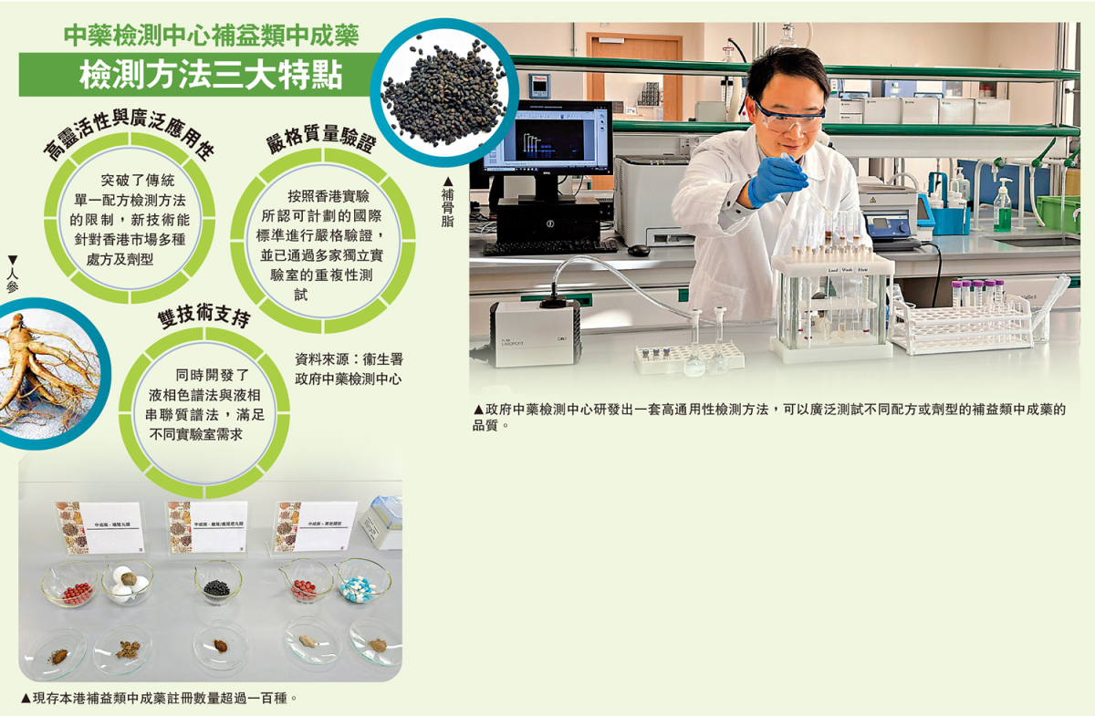 發揮香港科研優勢,中藥研究取得突破。中藥業界人士表示,以往藥廠需用數年時間、花費數十萬元,自行為每種補益類中成藥研製檢測方法,現時使用檢測中心的方法數月就可完成,檢測成本亦可降到兩至三萬。中藥檢測中心表示,新技術可協助業界解決中成藥檢測的難點和痛點,為中成藥建立國際認可的質量標準,推進中藥標準化及國際化。