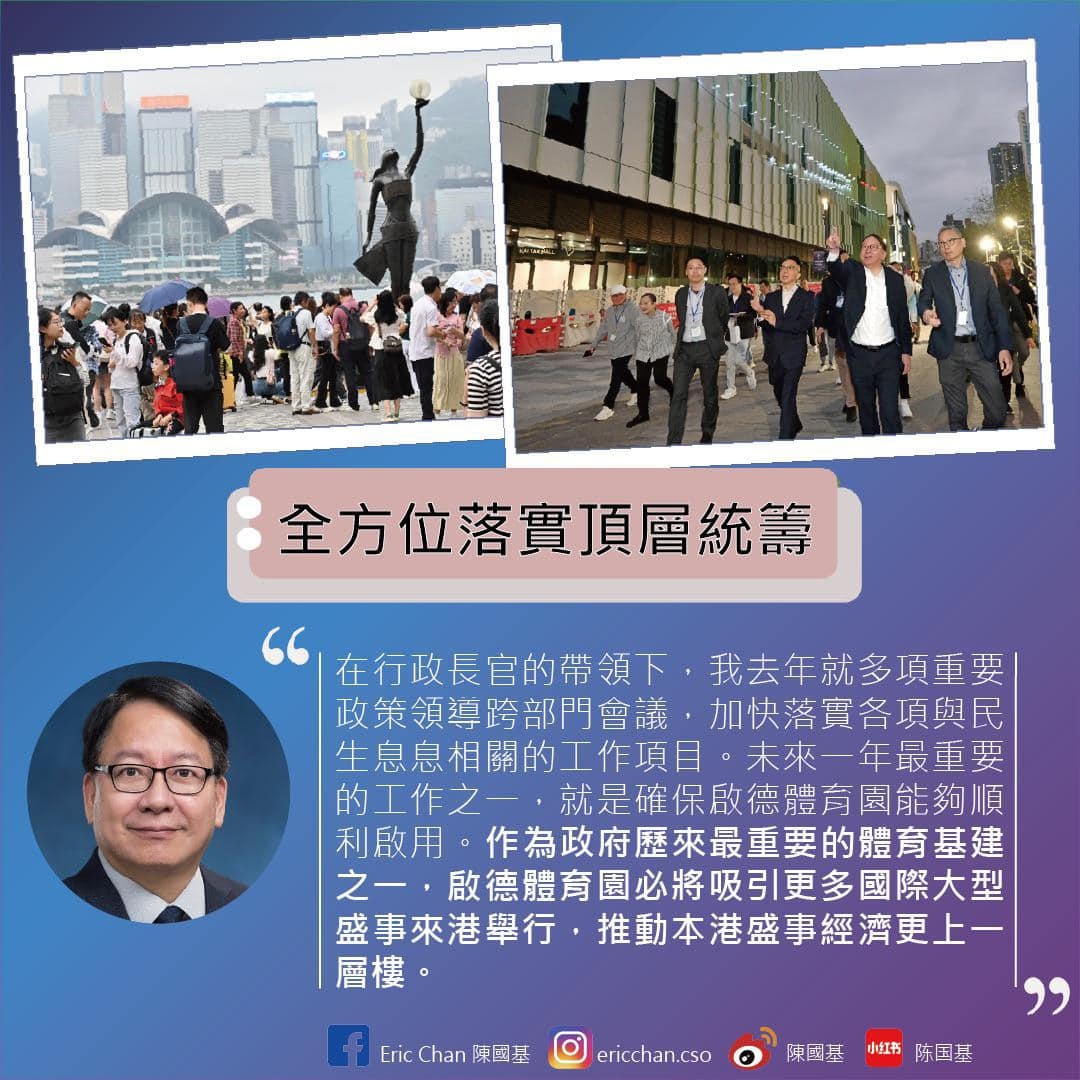 當局亦全方位落實頂層統籌,加快落實各項重要政策和措施。陳國基指,未來一年最重要的工作之一,就是確保啟德體育園能夠順利啟用。啟德體育園正式啟用在即,各場館正陸續舉行不同類型和大小的測試賽,必將吸引更多國際大型盛事來港舉行。