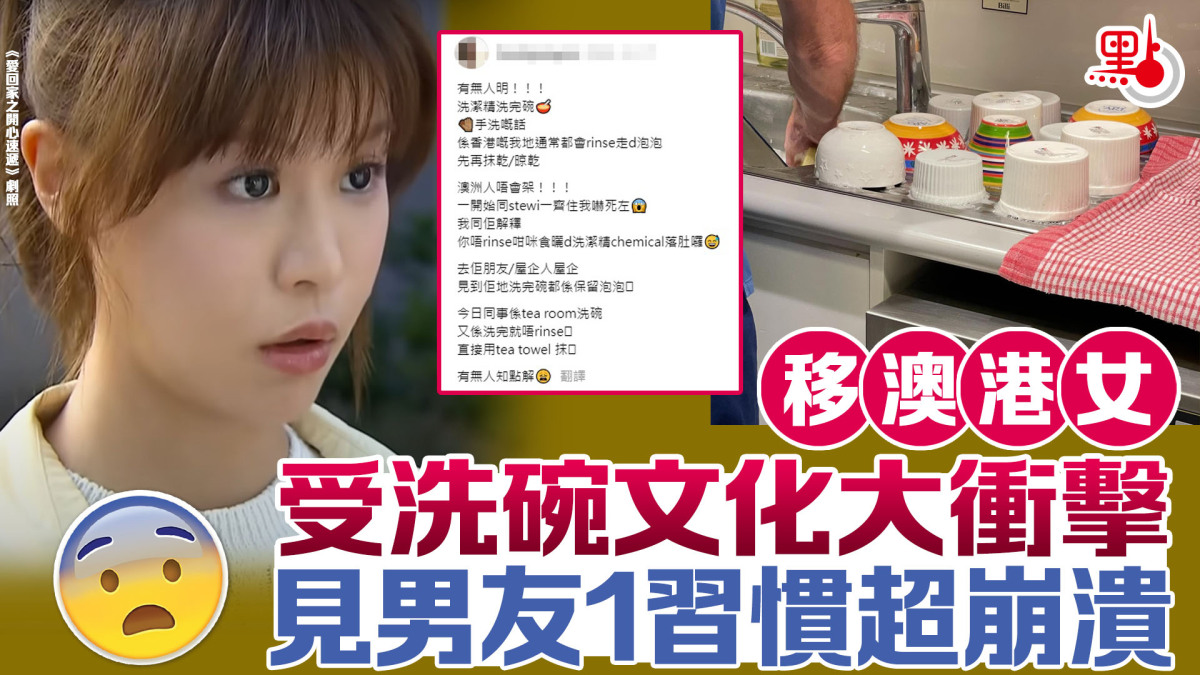 該名移民澳洲3年的香港女護士近日在社交平台threads發文表示,在香港通常用洗潔精洗完碗,都會用水將泡泡沖洗乾淨,然後再抹乾或晾乾。但當她與澳洲男友同居後,發現男友用洗潔精洗完碗後,竟不沖洗就將仍滿是泡泡的碗直接放置一邊晾乾,令她大為震驚「一開始同佢一齊住我嚇死咗」。隨後,她亦同男友解釋,「唔rinse咁咪食晒啲洗潔精chemical落肚囉」。