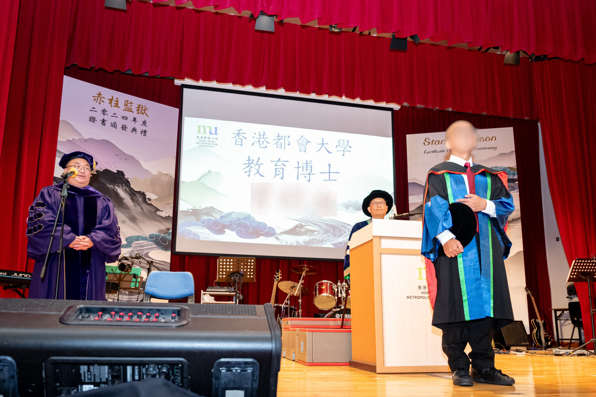 【點新聞報道】懲教署轄下的赤柱監獄今日(8日)舉行證書頒發典禮,向38名在囚人士頒發學業證書。獲頒人士中,一人獲都大頒授通識教育學士學位,兩名獲頒通識教育副學士學位,更有一名在囚人士獲都大頒授教育博士學位——該名在囚人士自2004年開始修讀香港都會大學(前身為香港公開大學)的遙距課程,歷經20年,成為首位獲本地大學頒授博士學位的在囚人士。