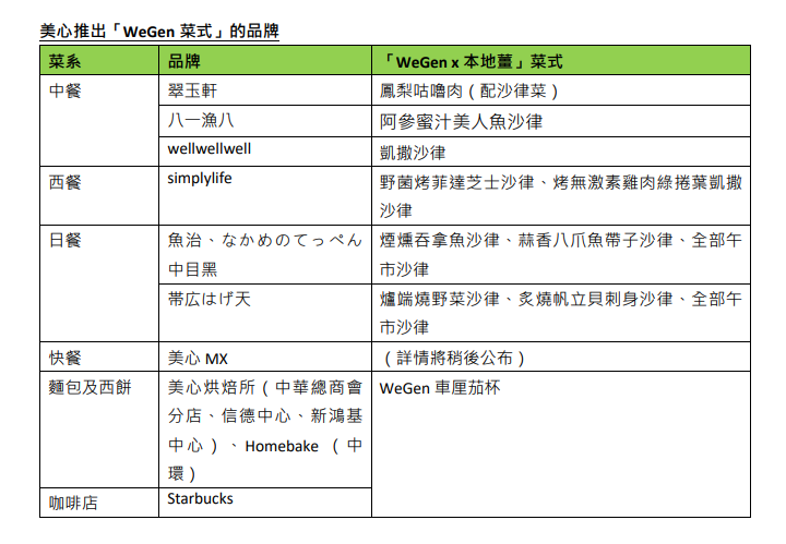 今期「WeGen計劃」推出「香煎豬扒飯伴紅酒燒汁配烤车厘茄及燴時蔬」、「煙燻脆皮腸拼雞扒飯伴意式鮮茄汁配烤车厘茄及燴時蔬」及「本地種植车厘茄沙律杯伴柚子油醋汁」三款菜式,將於30多间合作院校和機構的員工或學生飯堂及醫院病人餐供應。除此之外,亦會有多款「WeGen菜式」,由即日至4月期間,分別在美心旗下30間指定中、西、日菜餐廳,快餐店,西餅店及咖啡店陸續推出。