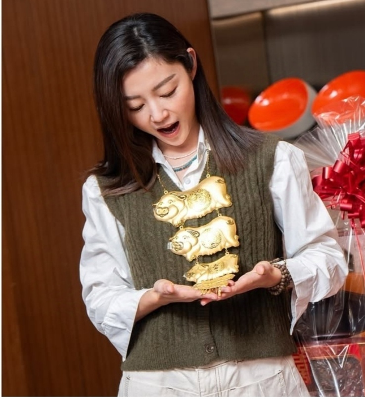 相中有大量金器﹑海味及喜餅等,她還戴上3塊贅手金豬牌,並貼出和醫美醫生未婚夫周祉安合照放閃:「原來過大禮係咁嘅感覺㗎!#終於有時間搞吓婚禮嘢#船到橋頭自然直#多謝整個過大禮團隊。」