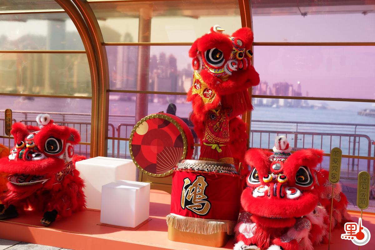 此外,海港城海運大廈正門添上歡樂喜慶的裝束。大樓梯貼上色彩奪目的大型「8」字吉祥圖騰,兩頭3米高的巨型黃色及青色醒獅更在入口恭迎大家,寓意左右逢源、得心應手、一帆風順。祝願大家穿過樓梯後,在新一年發展順利,步步高升,發光發熱又發財。另外,海運大廈地下中庭化身成「新春醒獅舞台」,讓早前已招募的小小醒獅班團員在場內訓練及表演;大人小朋友可於舞台跟五頭威風凜凜的醒獅及舞獅旗打卡外,更可學習傳統醒獅的習俗及寓意。