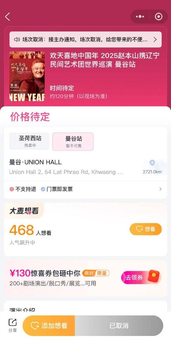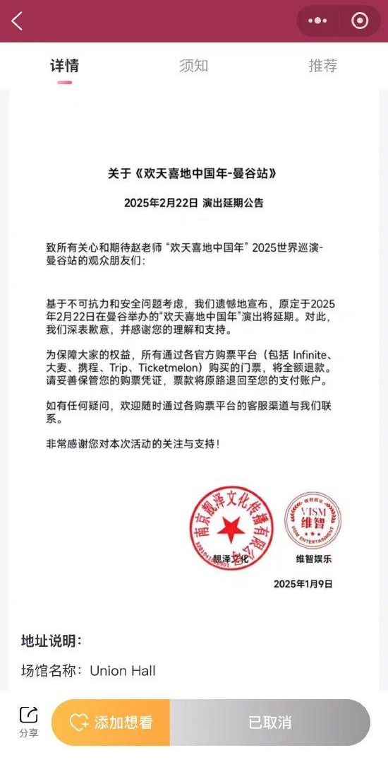 相關聲明指:「基於不可抗力和安全問題考慮,我們遺憾地宣布,原定於2025年2月22日在曼谷舉辦的『歡天喜地中國年』演出將延期。」聲明還表示將全額退款。
