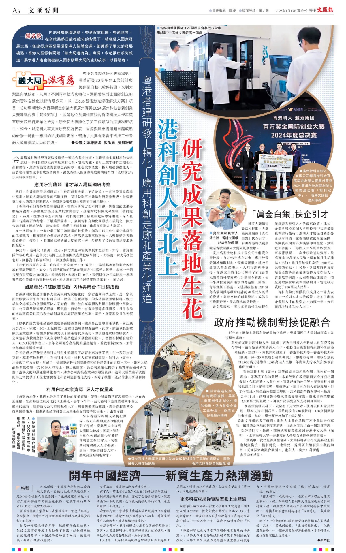 香港智能製造研究專家湯凱,帶着研發20多年的工業設計與製造業自動化軟件技術,來到大灣區內地城市,只用了不到兩年就成功轉化。湯凱帶領博士團隊創立的廣州智科自動化技術有限公司,以「Zicus智能激光熔覆解決方案」項目,成功奪得港科大百萬獎金創業大賽廣州賽與2024廣州科技創新創業大賽港澳台賽「雙料冠軍」,並落地位於廣州南沙的香港科技大學霍英東研究院進行產業化培育。研究院先後孵化了近百個類似的港澳科研項目。如今,以港科大霍英東研究院為代表,香港與廣東搭建起日趨成熟的研發—轉化—應用的科技創新走廊,暢通了大批香港青年科技工作者融入國家發展大局的通道。