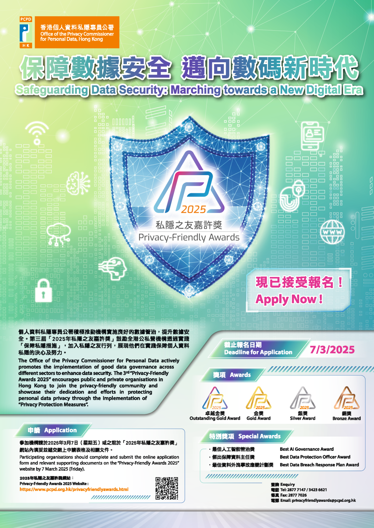 【點新聞報道】由個人資料私隱專員公署主辦的「2025年私隱之友嘉許獎」今日(13日)起接受報名。今屆嘉許獎以「保障數據安全 邁向數碼新時代」為主題,旨在表揚及嘉許機構在保障個人資料私隱的決心及表現,同時鼓勵機構實施良好的數據管治,提升機構保障個人資料私隱的意識及數據安全。