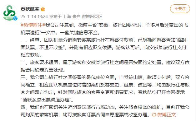 春秋航空今日(14日)發文稱,公司注意到,微博平台「安徽一旅行團要求退一個多月後赴泰國的飛機票遭拒」一文中,一些關鍵信息不全。春秋航空表示,經查,團隊機票分銷商安徽某旅行社在遊客付款前,已明確向遊客告知「臨時團隊票,不退不改簽」,並附有相應圖文依據。遊客認可後,向安徽某旅行社支付相應款項。旅客要求退團,屬於遊客和安徽某旅行社之間是否按照約定處置,建議雙方依據合同約定妥善處理。