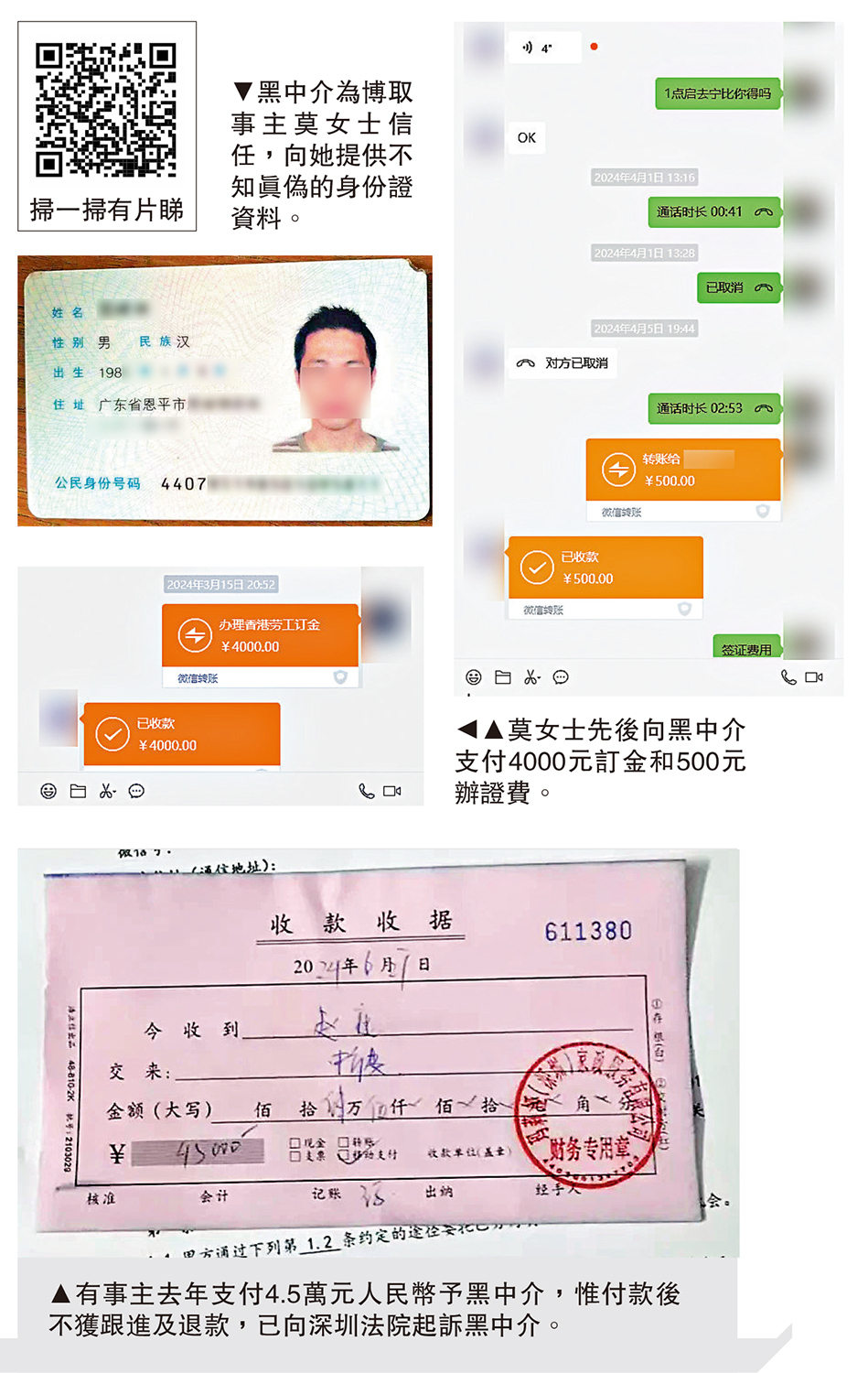2024年3月,這名中介在收取了莫女士4000元訂金和500元辦證費後,便要求她耐心等待,並在期間不斷承諾莫女士能夠赴港工作。直到去年的12月,莫女士突然無法再聯繫上該名中介,才發現原來上當受騙。莫女士的朋友向她透露,曾在香港的果欄有人見過該名中介,並向中介表示莫女士在找他,但這名中介假裝沒聽到便拔足而逃。