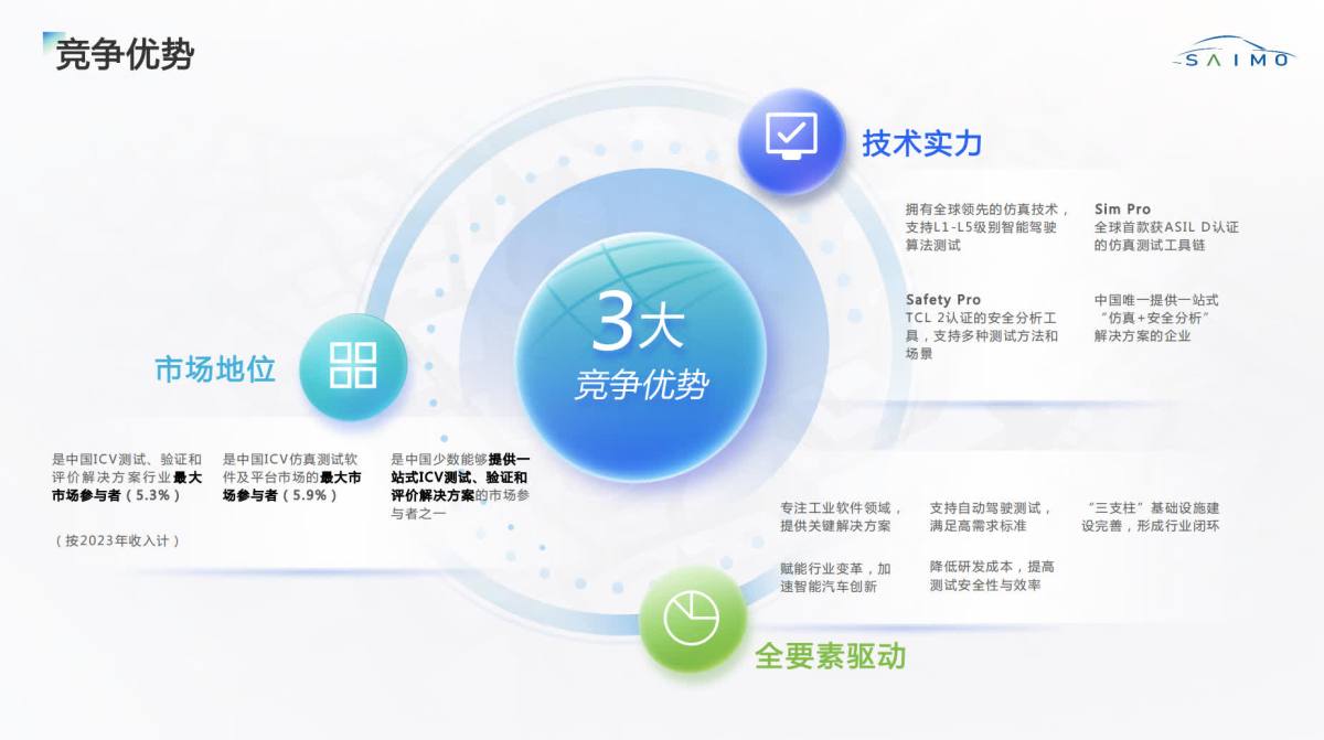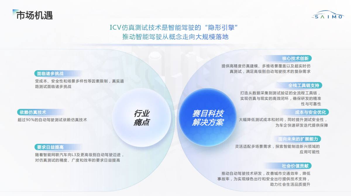 據介紹,智能網聯汽車(ICV)仿真測試領域具有廣闊的市場前景。根據弗若斯特沙利文數據,中國ICV行業市場規模預計從2023年的1653億元增長至2030年的6596億元,年均複合增長率約20.1%;其中ICV測試、驗證和評價解決方案行業市場規模將以33.6%的年均複合增長率增長至279億元。賽目科技致力於解決行業關鍵痛點,並持續創新,為行業提供全面的工具鏈解決方案。工具鏈以SimPro(仿真平台)和SafetyPro(綜合安全分析工具)為核心,兩款產品已通過ISO26262標準的功能安全認證,成為賽目科技技術壁壘和利潤增長點的重要組成部分。憑藉技術優勢和市場前瞻性,賽目科技正成為智能駕駛從概念邁向規模化落地的「隱形引擎」,也是這一高速增長中的最大受益者。