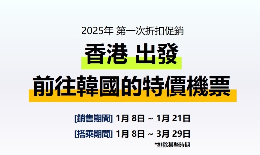優惠活動今日(21日)截止,旅遊日期訂票起至3月底。乘客於真航空官網預訂香港至仁川機票,輸入專屬優惠碼「25FLYKR2」即可享有此優惠。往返機票連稅最低1045港元起,還包含15公斤寄艙行李及10公斤手提行李。
