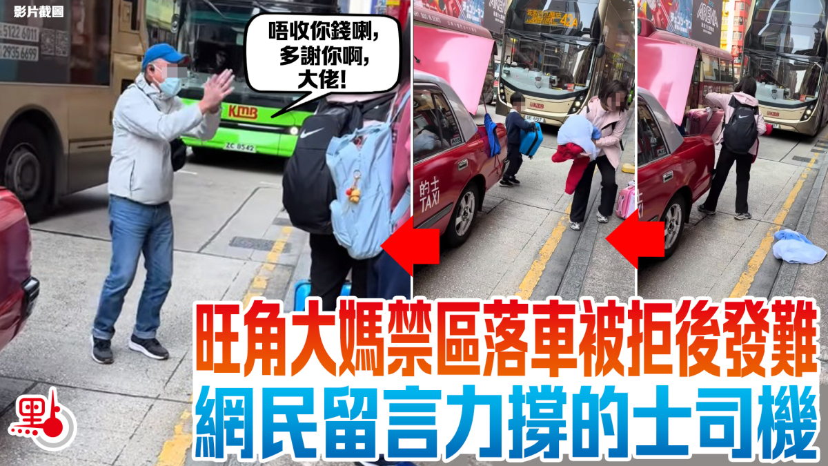 有網民在fb群組「香港交通及突發事故報料區」上載影片,可見一名大媽帶同小孩乘的士,並於旺角下車,當時大媽怒氣衝衝從車尾箱拿行李,一旁小孩亦有幫忙,大媽不滿地表示「不讓我下車」。其後,的士司機下車,走到路邊向大媽解釋:「錢收唔收唔緊要,你叫我中間落車呀大佬!」、「有啲咩意外邊個負責!」