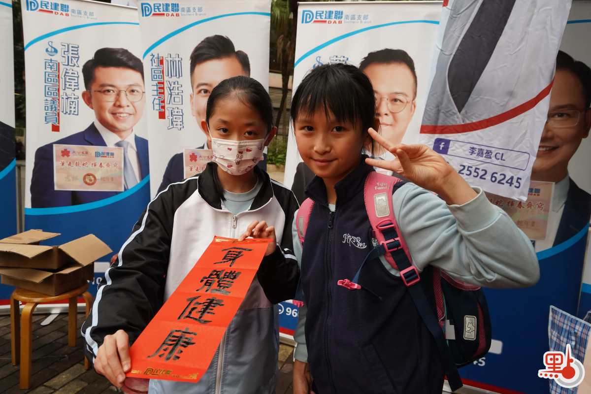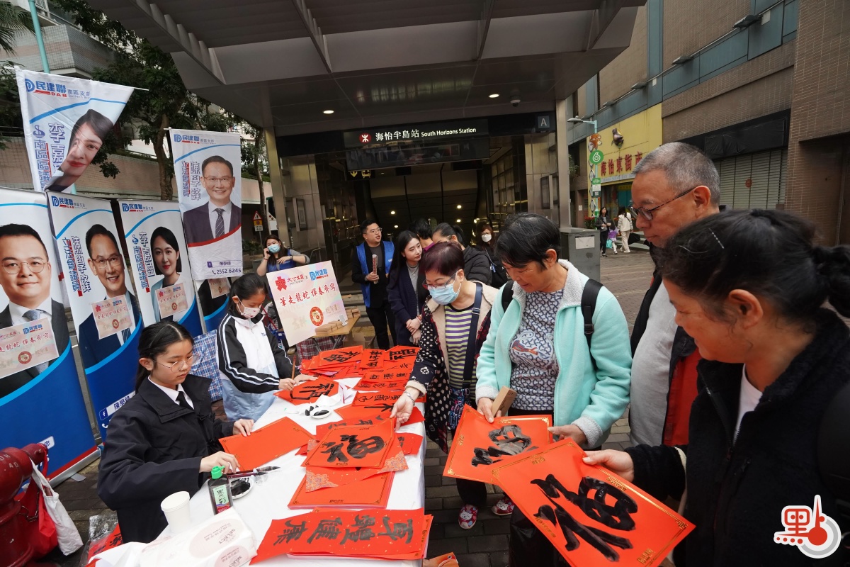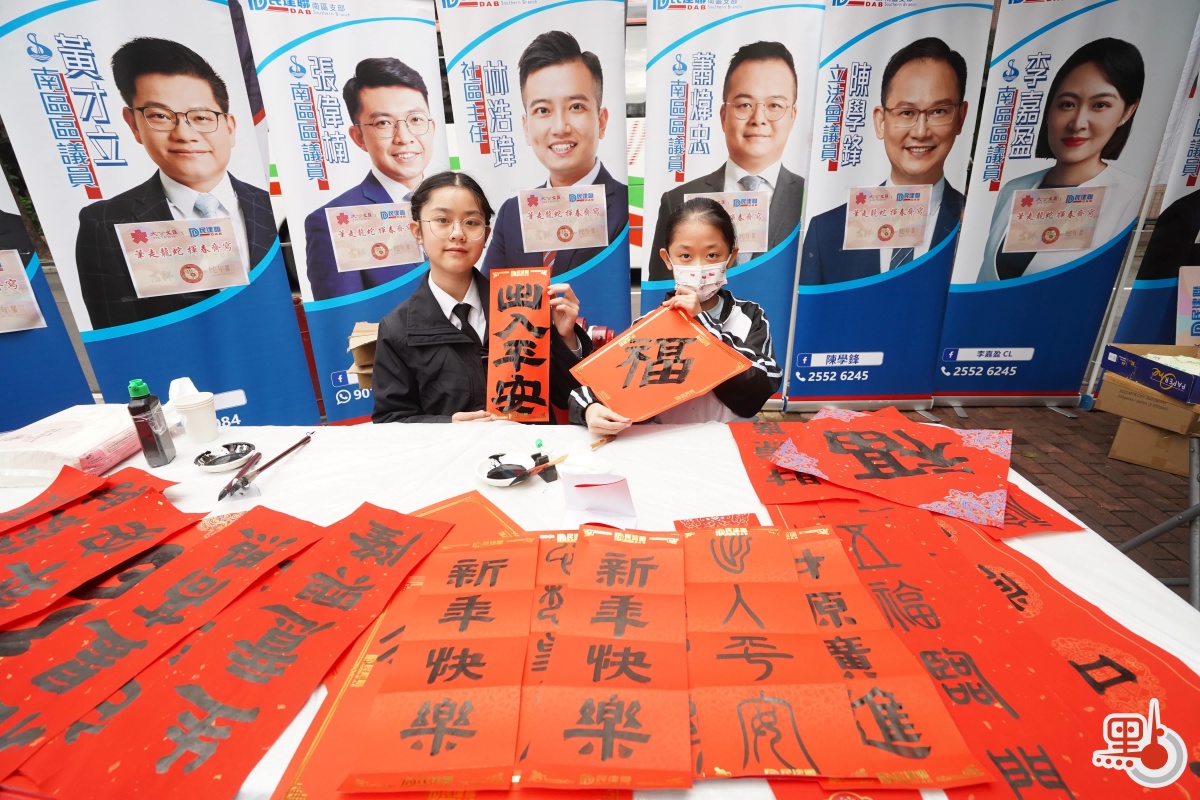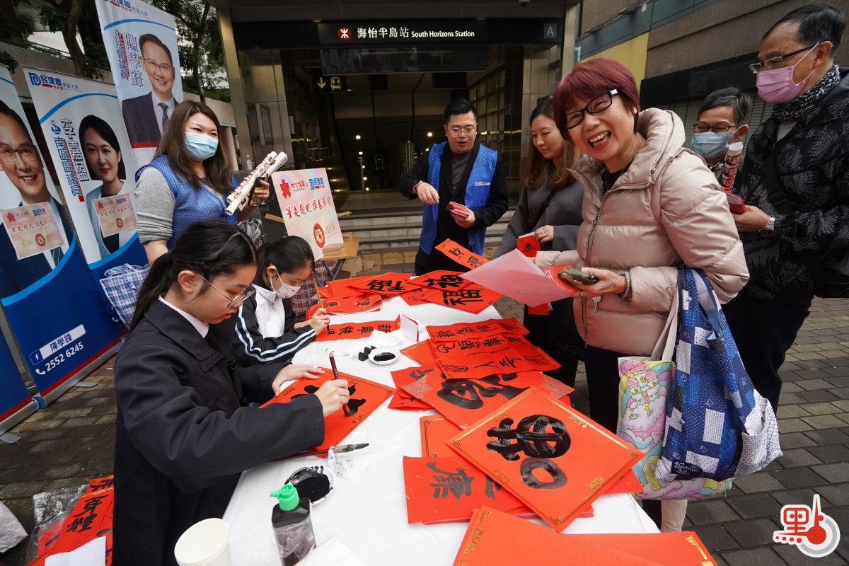 今年的揮春活動名為「筆走龍蛇 揮春齊寫」,於今日(23日)下午4時半至5時半分別在南區海怡、九龍黃大仙和新界沙田三個地點舉行。記者走訪了南區海怡,見到現場除了學生們揮毫送上春聯,還準備了利是封、手機支架以及年曆贈送市民,吸引不少市民駐足欣賞,氣氛火熱。