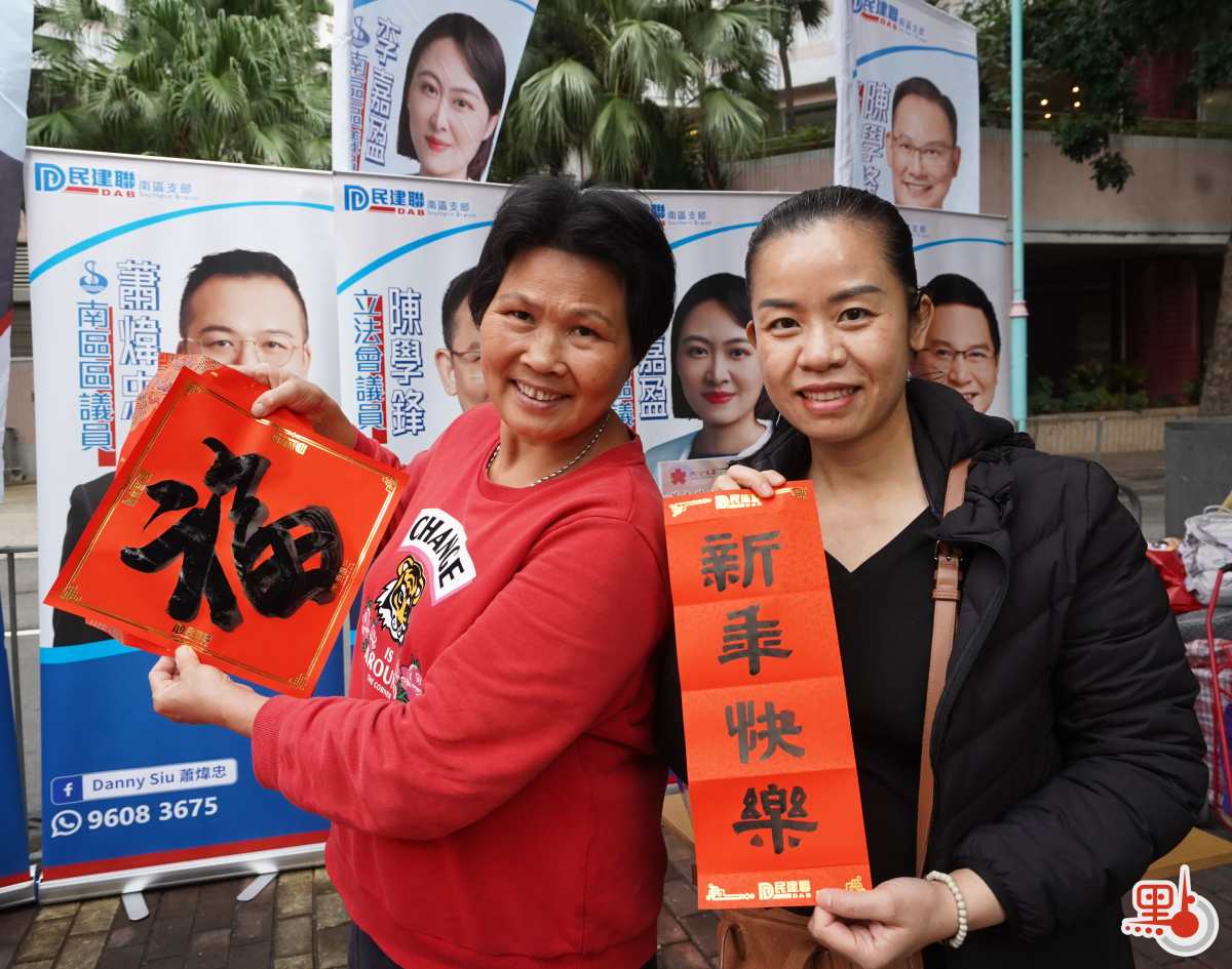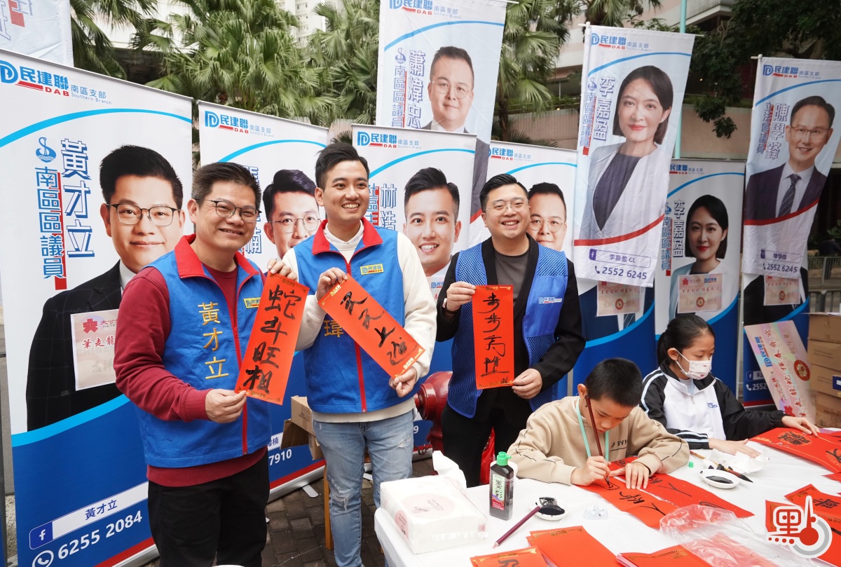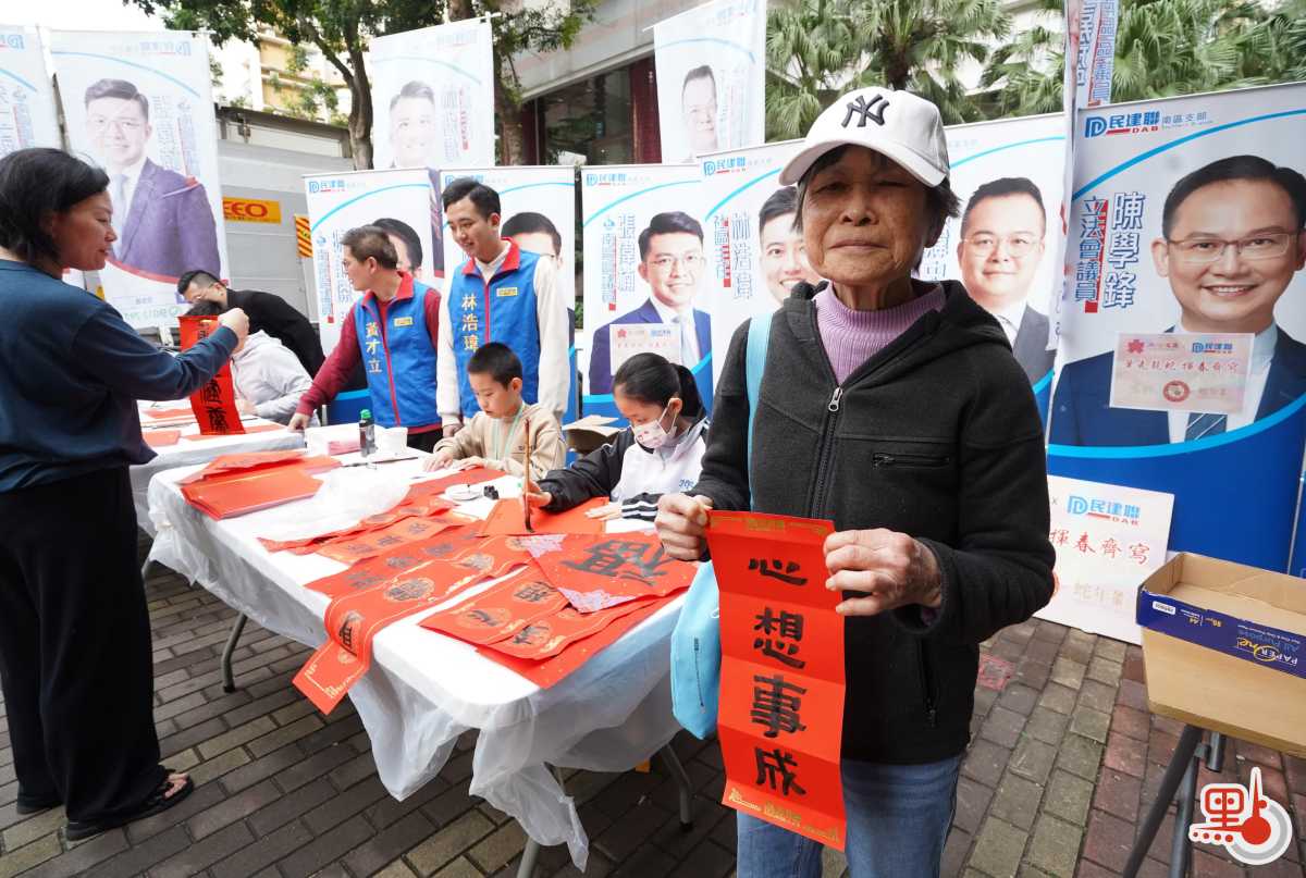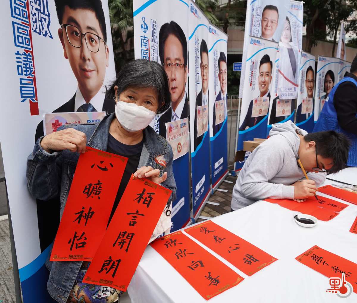 今年的揮春活動名為「筆走龍蛇 揮春齊寫」,於今日(23日)下午4時半至5時半分別在南區海怡、九龍黃大仙和新界沙田三個地點舉行。記者走訪了南區海怡,見到現場除了學生們揮毫送上春聯,還準備了利是封、手機支架以及年曆贈送市民,吸引不少市民駐足欣賞,氣氛火熱。