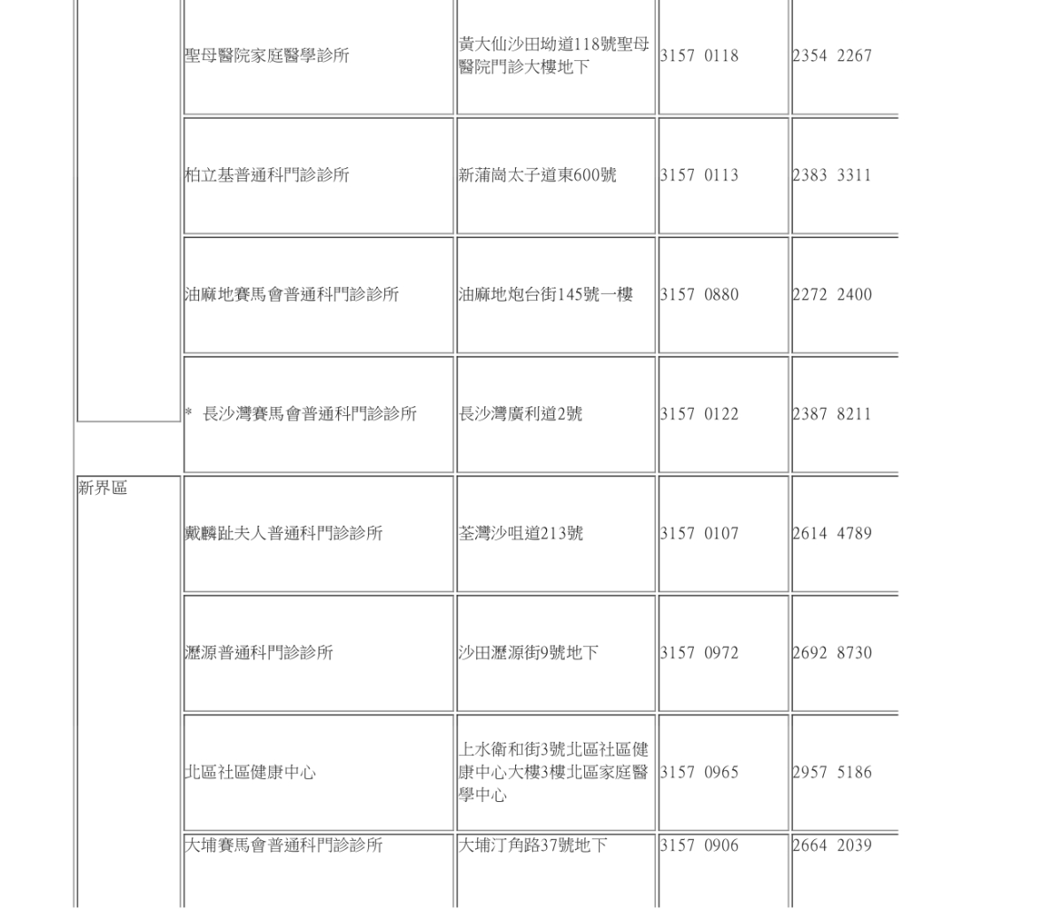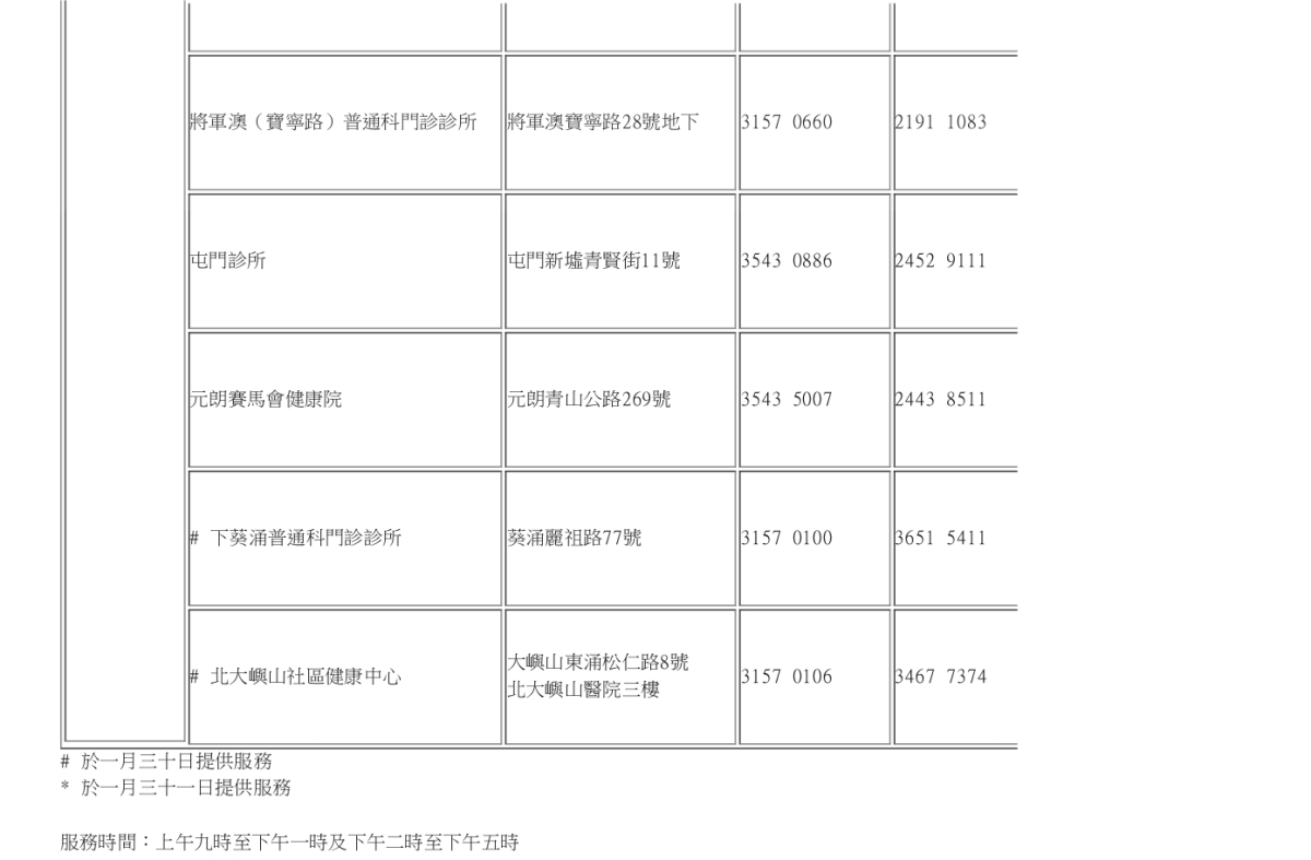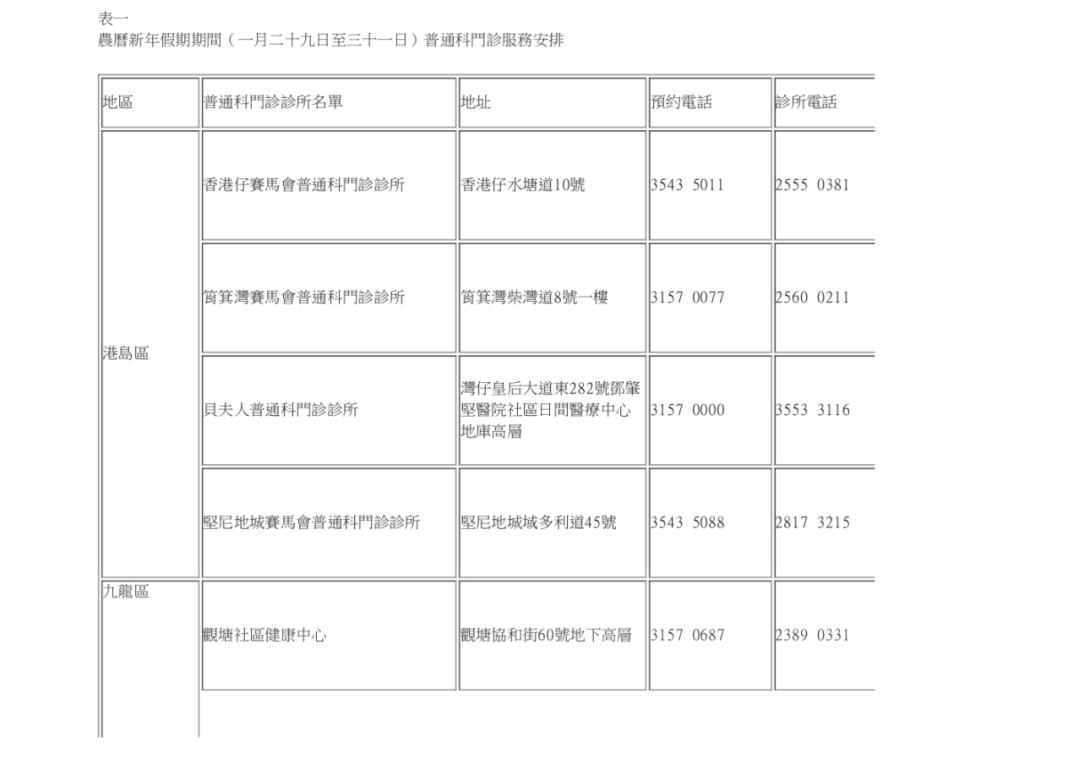 農曆新年假期期間普通科門診服務安排: