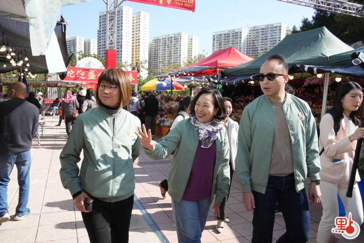 現場攤檔擺滿年花和賀年飾品,琳瑯滿目,氣氛熱鬧。李家超一行到訪不同攤位,同市民打招呼。李家超指,今日是個喜慶日子,特地來屯門感受節慶氣氛,看到不同攤檔產品受歡迎程度各有不同,相信入夜之後氛圍會更好。
