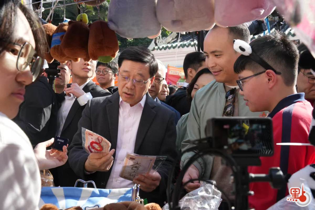 【點新聞報道】行政長官李家超聯同民政及青年事務局局長麥美娟、環境及生態局局長謝展寰,今日(28日)到訪屯門天后廟廣場年宵市場,同市民齊賀蛇年。李家超現場花費350元購買劍蘭、風車和大熊貓掛飾,並獲學生攤檔贈送如意結。李家超表示,高興看到有攤檔的生意理想,相信臨近新年,生意會更好。他又祝願市民一切順利,家庭幸福。