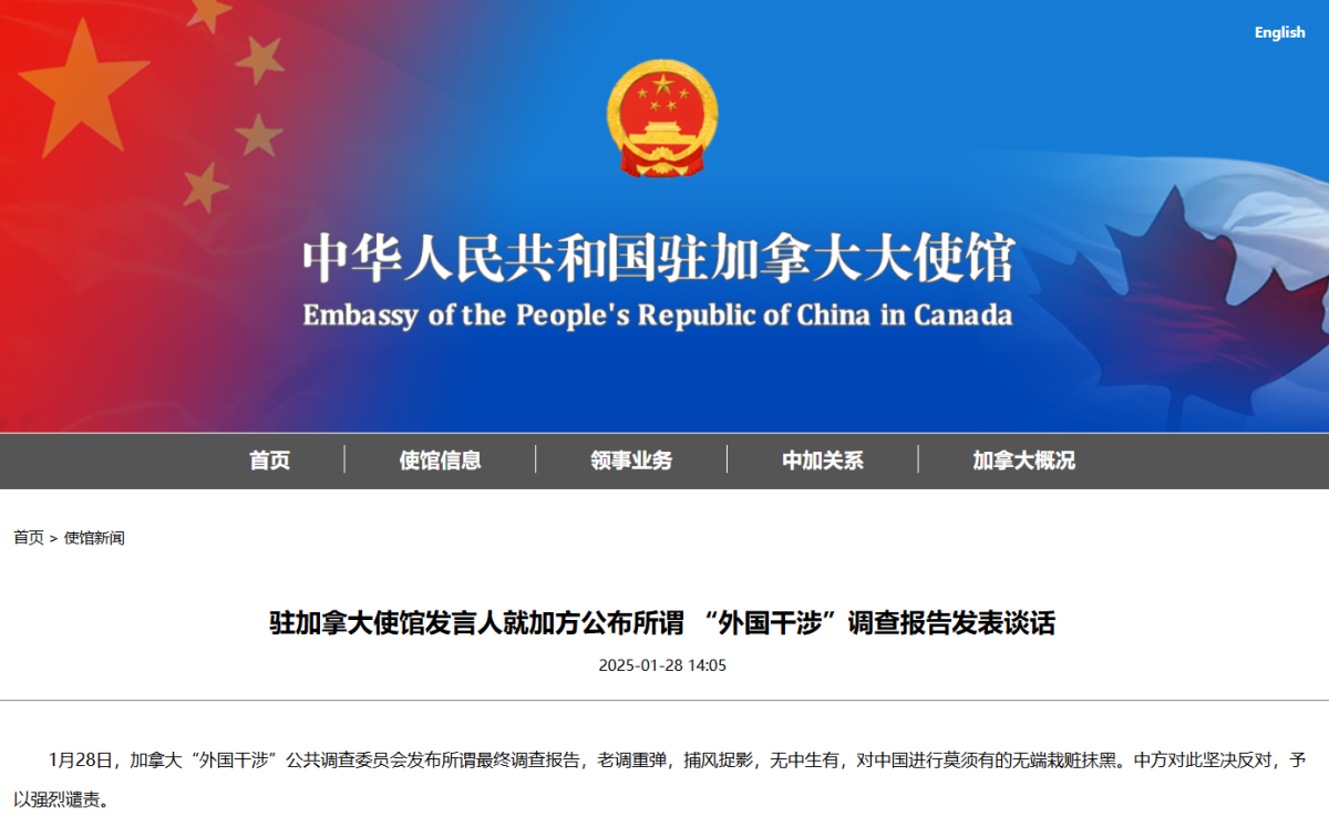 【點新聞報道】據中國駐加拿大使館網站消息,1月28日,加拿大「外國干涉」公共調查委員會發布所謂最終調查報告,老調重彈,捕風捉影,無中生有,對中國進行莫須有的無端栽贓抹黑。中方對此堅決反對,予以強烈譴責。
