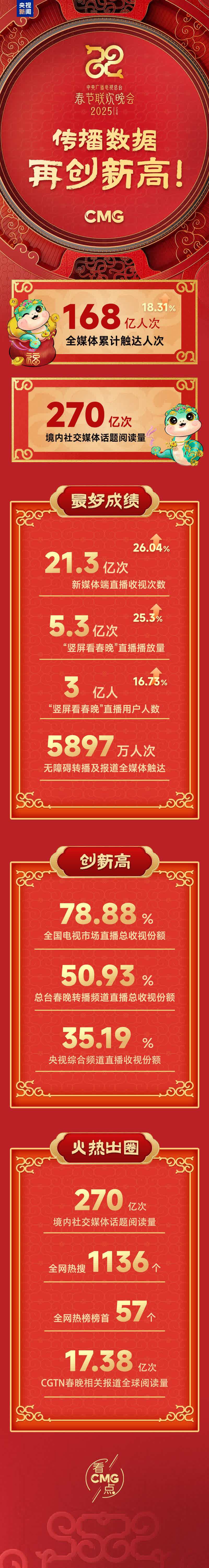 電視收視創多年來新高。總台2025年春晚在全國電視市場的直播總收視份額達78.88%,創近12年以來收視新高。其中,總台春晚轉播頻道的直播總收視份額達50.93%,央視綜合頻道(CCTV-1)直播收視份額35.19%,均創近14年以來收視新高。