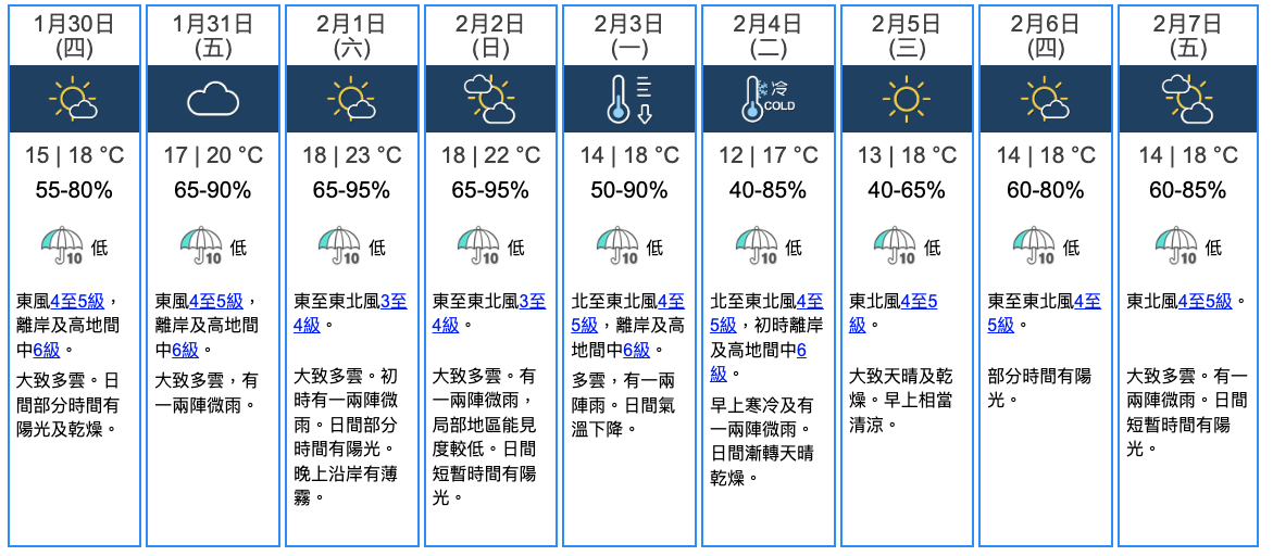 天文台預測,一股清勁至強風程度的偏東氣流會在今明兩日影響廣東沿岸,該區雲量增多及有一兩陣微雨,早晚仍然清涼。隨着該偏東氣流在周末期間緩和,沿岸地區天氣會較為潮濕,日間和暖。預料一道冷鋒會在星期日稍後至星期一初時抵達華南沿岸,該區有一兩陣雨,與其相關的冬季季候風會在隨後一兩日為該區帶來寒冷及乾燥的天氣。