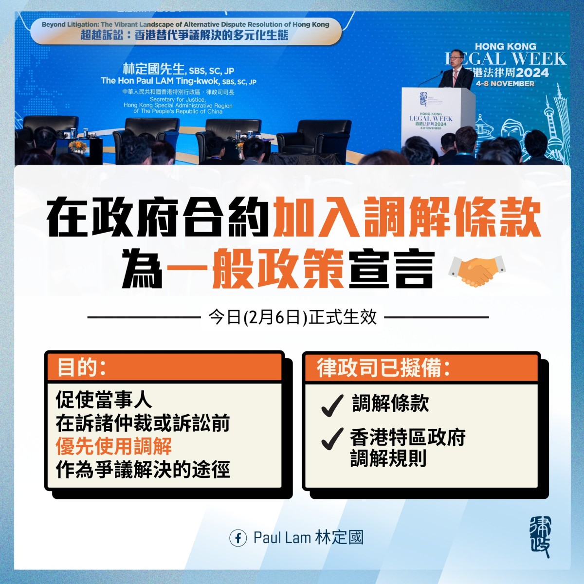 林定國在社交平台表示,政府期望透過牽頭在合約中加入調解條款,以身作則,鼓勵私人公司跟隨,進一步推廣「調解為先」文化。律政司將為各政策局和部門提供支援及監察,確保政策順利推行。