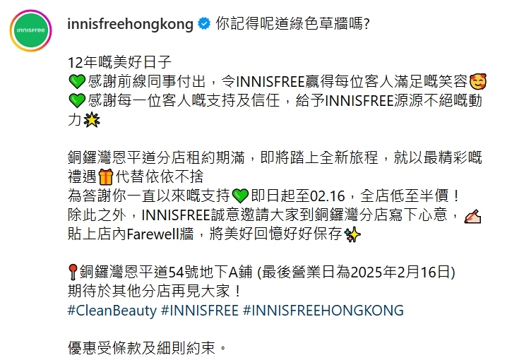 INNISFREE銅鑼灣店開業12年,其綠色草牆格外引人注目,已經成為恩平道一帶的地標及「等人位」。有網民留言表示以後不知去邊度等人,也有人建言「換間大舖」。店內特設「Farewell牆」,讓客人寫下心意。
