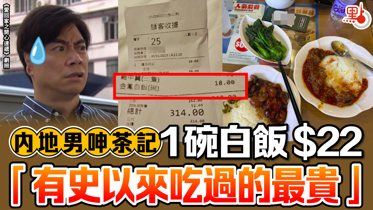 【點新聞報道】「天價白飯」?有內地男遊客在於小紅書發文,指趁農曆新年假期到山頂一間茶餐廳用膳,沒想到一碗白飯要價18元,連「加二(20%)服務費」3.6元,即一碗白飯需付近22元,大呻「有史以來吃過的最貴的一碗白米飯」。