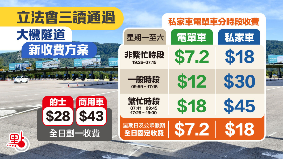政府將於大欖隧道實施分時段收費,所有車種的隧道收費比現時將大幅下調,即私家車收費介乎18元至45元;電單車(包括機動三輪車)收費介乎7.2元至18元;的士收費全日劃一28元;其他商用車包括貨車、巴士等全日劃一43元。上述收費將於今年5月31日政府收回隧道起生效。「易通行」亦將會在大欖隧道實施,運輸署稍後會公布詳情。