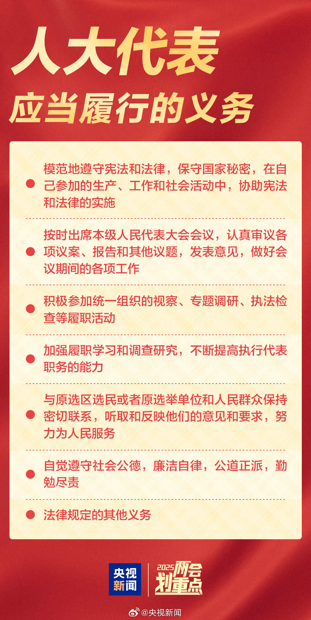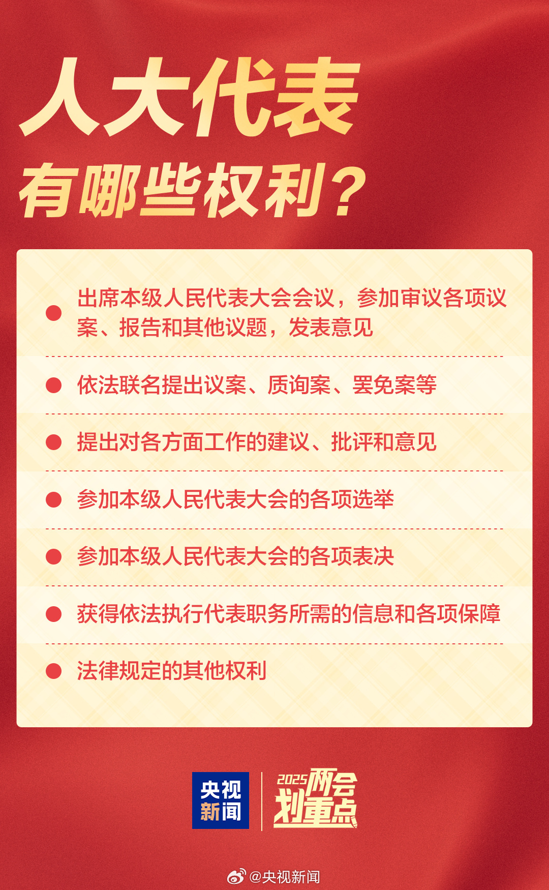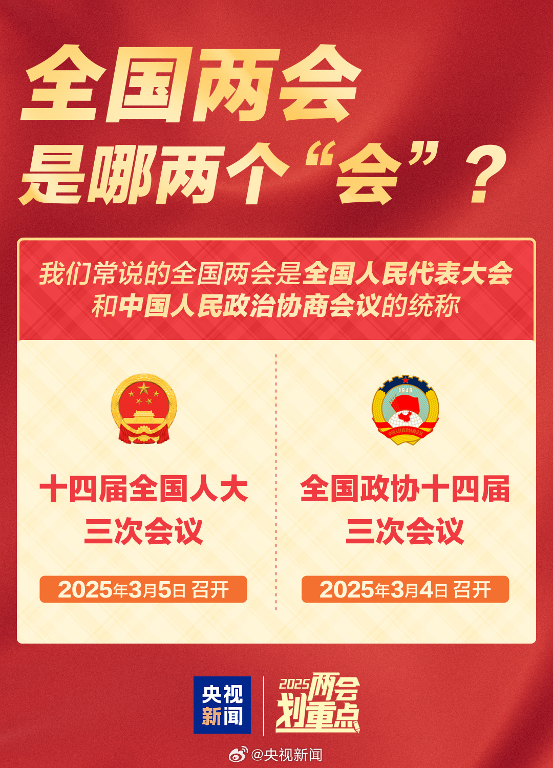 【點新聞報道】2025年全國兩會即將召開,十四屆全國人大三次會議將於3月5日開幕,全國政協十四屆三次會議將於3月4日開幕。全國兩會是哪兩個會?都有哪些議程?人大代表和政協委員是如何產生的?人大代表和政協委員都有哪些權利?今天就來揭曉答案!