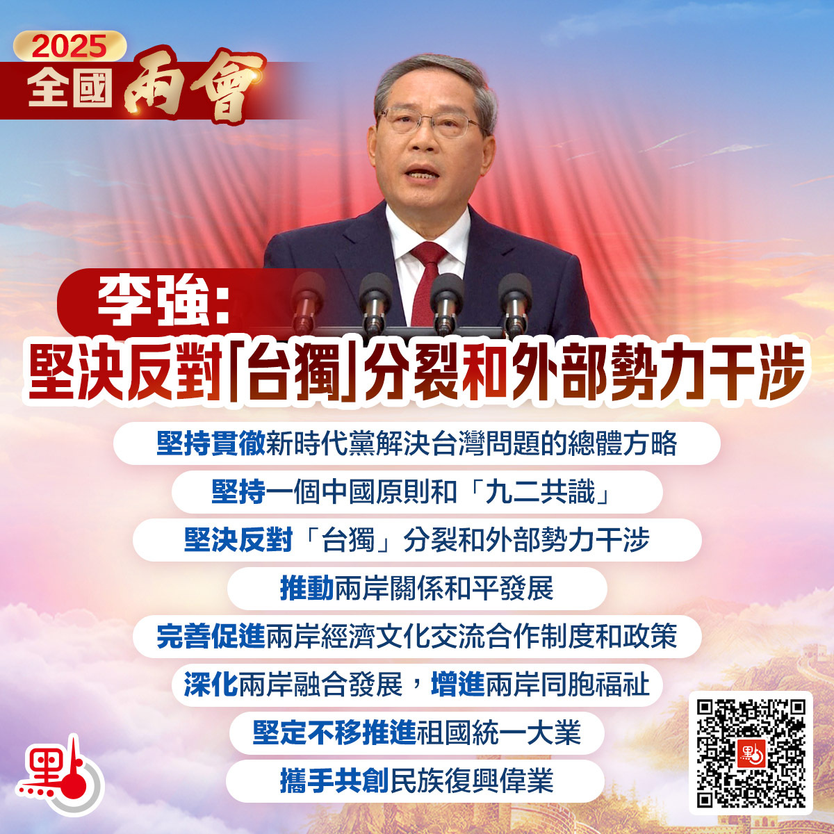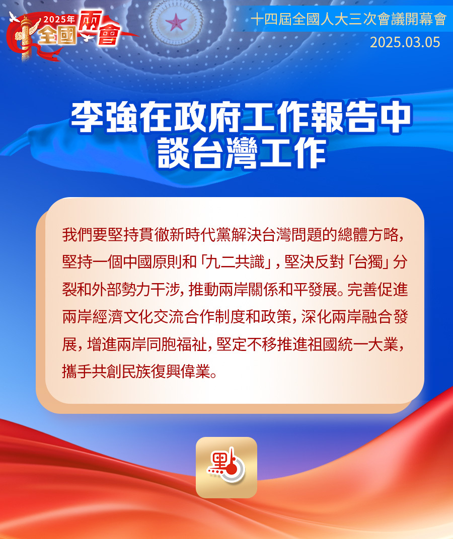 政府工作報告提到,我們要堅持貫徹新時代黨解決台灣問題的總體方略,堅持一個中國原則和「九二共識」,堅決反對「台獨」分裂和外部勢力干涉,推動兩岸關係和平發展。完善促進兩岸經濟文化交流合作制度和政策,深化兩岸融合發展,增進兩岸同胞福祉,堅定不移推進祖國統一大業,攜手共創民族復興偉業。