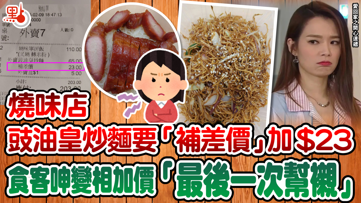 【點新聞報道】近日有名女街坊在網上發文,指早前到馬鞍山一間燒味店外賣了叉燒湯米及豉油皇炒麵。但是十多嚿叉燒看上去又乾又瘦,更離譜的是炒麵因在星期日購買,要收「補差價」23元,價格由65元變88元,全單合計203元。女街坊十分不滿,稱是最後一次幫襯。
