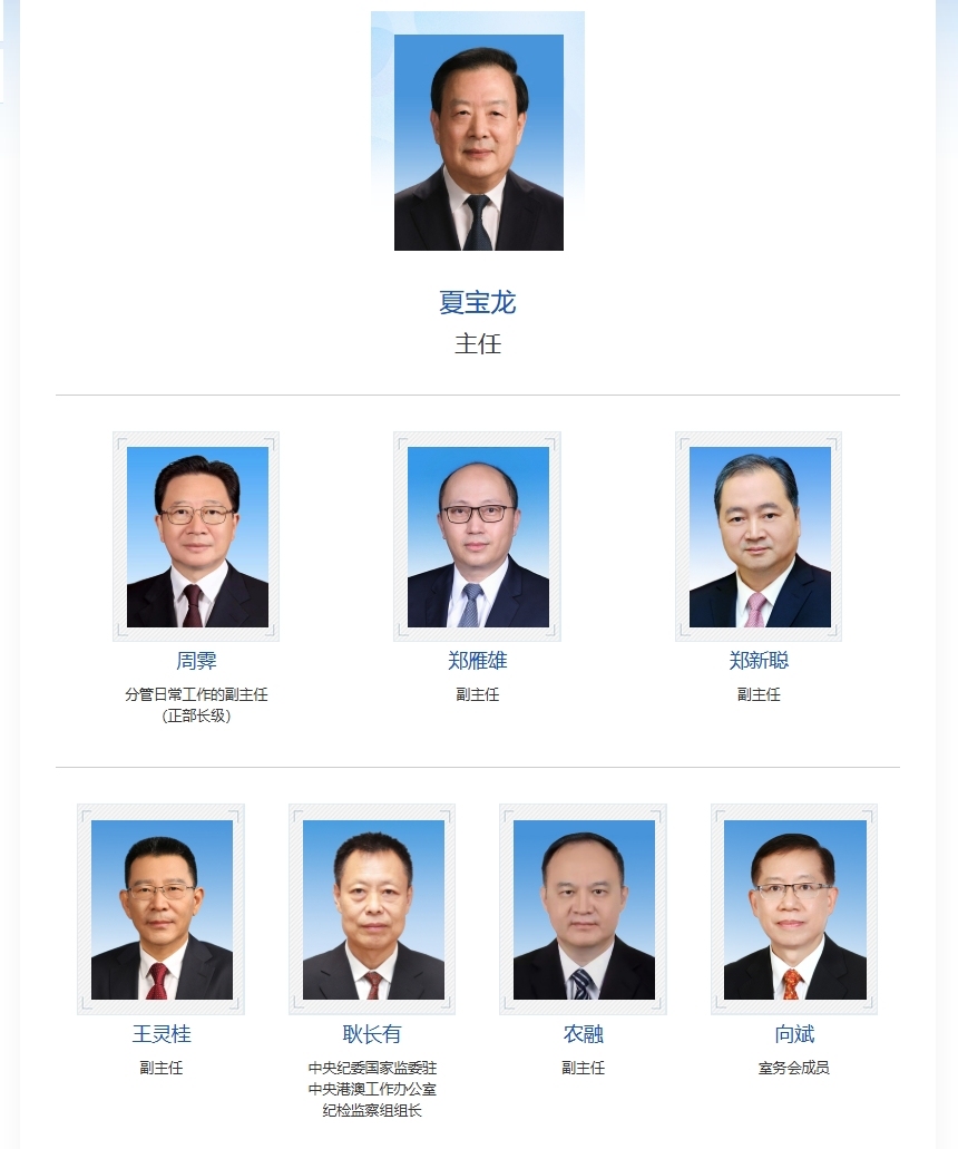 官網顯示,中央港澳工作辦公室主任、國務院港澳事務辦公室主任為夏寶龍,副主任有五位,分別是周霽(分管日常工作的副主任,正部長級)、鄭雁雄、鄭新聰、王靈桂、農融。中央紀委國家監委駐中央港澳工作辦公室紀檢監察組組長為耿長有,中央港澳工作辦公室室務會成員為向斌。在排名方面,耿長有的排名在王靈桂之後,在農融之前。