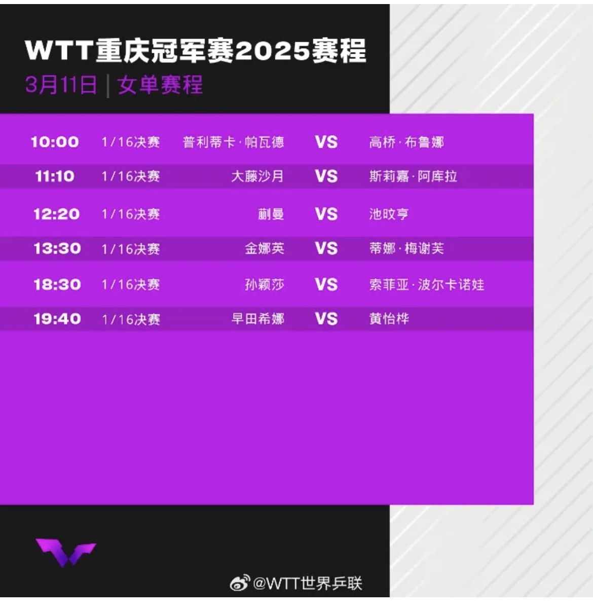 WTT重慶冠軍賽從3月11日開始,持續至3月16日。每天分為上午和下午兩個賽段,採用單淘汰賽制,男女單打各32名選手參賽,共62場比賽。首輪至決賽全程7局4勝制,決賽日(3月16日)將誕生冠軍。