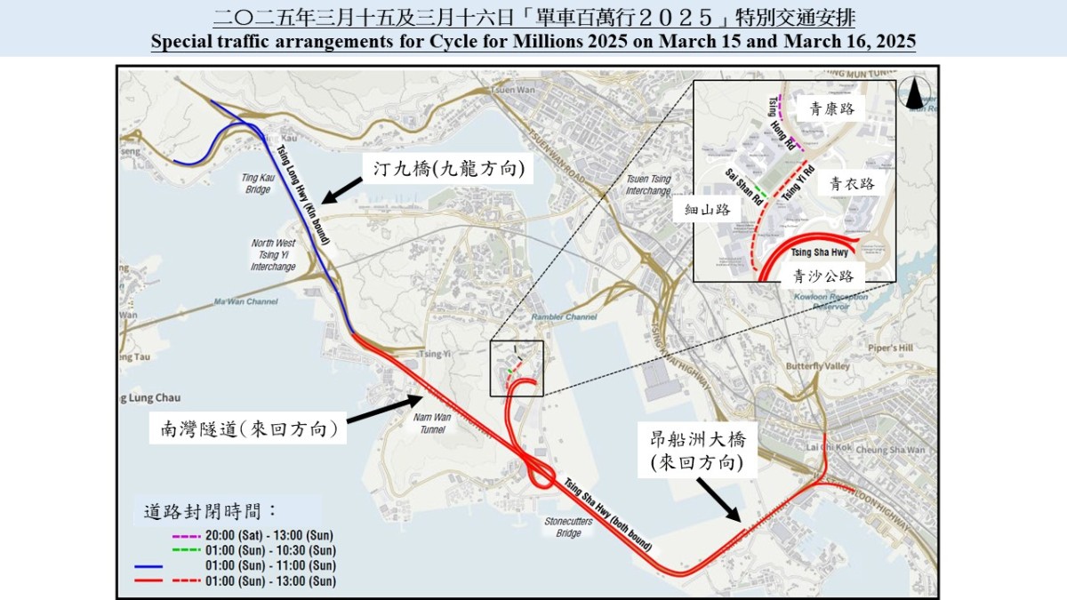 警方指出,會在周日凌晨1時起開始逐步封路,包括屯門公路往汀九橋支路、青朗公路近大欖隧道出口等,車輛不能駛往汀九橋;在九龍方面,西九龍公路往青沙公路支路亦會封閉,駕駛者可使用三號幹線及長青隧道前往機場或青衣一帶。賽事進行期間,八號幹線青沙公路介乎昂船洲大橋至南灣隧道一帶的兩邊行車線封閉。警方會視乎比賽及清理賽道的進度,分兩階段於上午約11時及下午約1時逐步解封道路。
