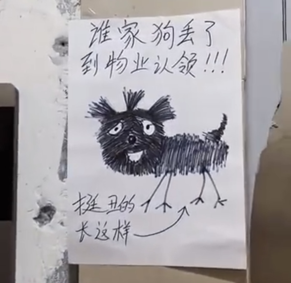 【點新聞報道】四川一名男子在住家電梯口發現了一張尋狗啟事,上面是用潦草的黑色原子筆畫的一隻小狗,配文「挺醜的」,令許多網民爆笑,感嘆「靈魂畫手」。