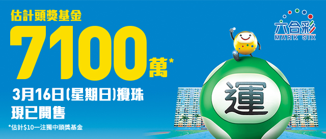 【點新聞報道】最新一期六合彩今晚(16日)9時30分進行攪珠,截止投注時間為晚9時15分。若以10元一注獨中,估計頭獎基金可獲高達7,100萬元彩金。