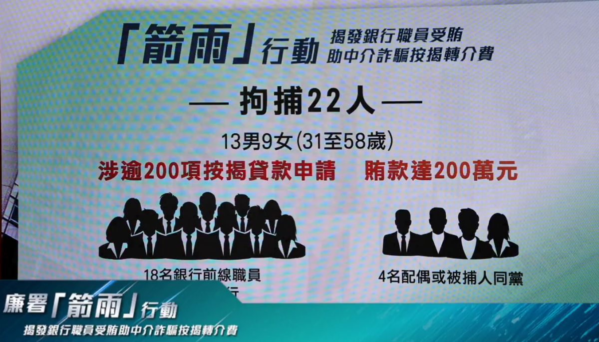 【點新聞報道】廉政公署今日(18日)舉行「箭雨」行動新聞簡報會,揭發銀行職員受賄助中介詐騙按揭轉介費的不法行為。行動共拘捕22人,包括18名銀行前線職員以及4名配偶或被捕人同黨,共13男9女,年齡介於31至58歲。
