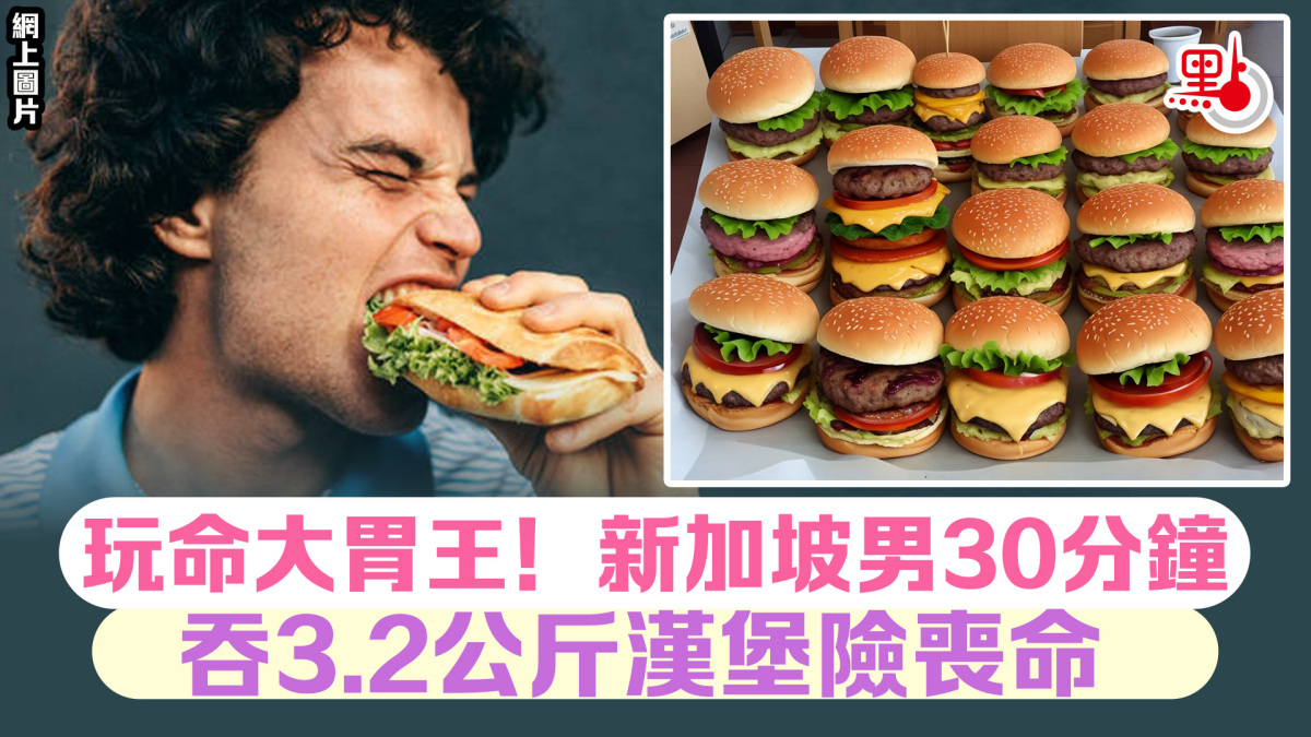 據《每日郵報》報道,一名30歲的男子參加新加坡「漢堡大胃王大賽」,在30分鐘內吞下3.2公斤的巨型漢堡,等同於一般快餐漢堡的十倍份量。儘管男子成功吃完了這份漢堡,但也因此導致腸胃承受了巨大壓力,胃部被撐大到近乎破裂。8小時後,男子被緊急送院。