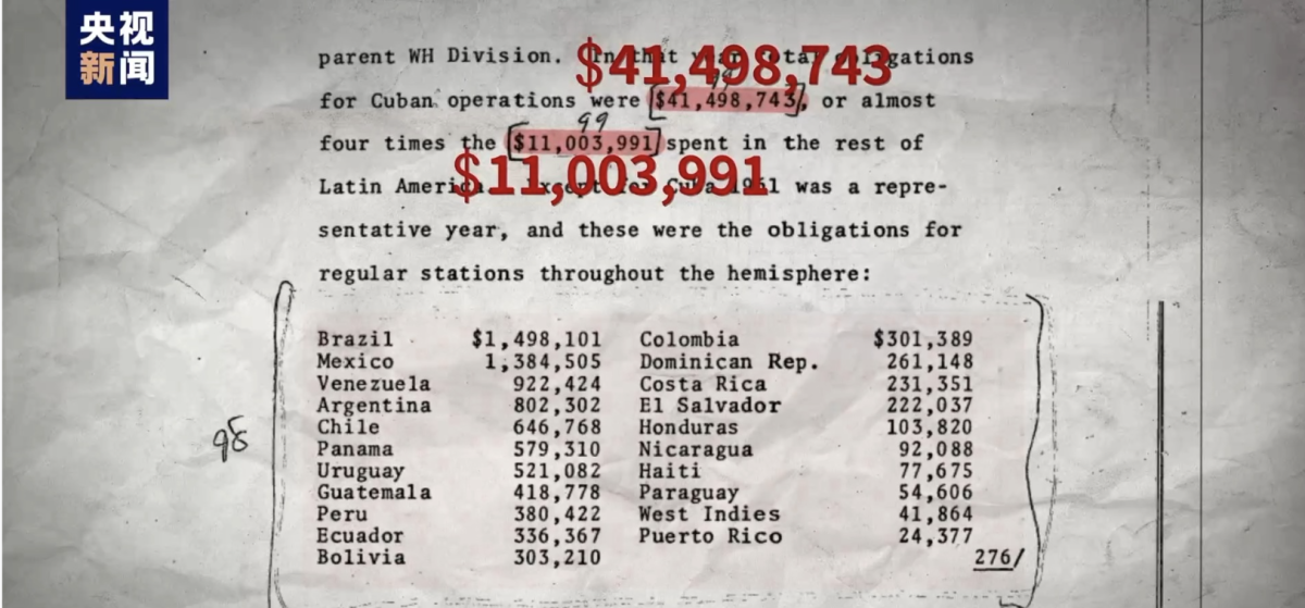1961年的一份賬單顯示,CIA在拉美21個國家都展開了行動,其中包括參與暗殺多米尼加共和國領導人特魯希略。對歐洲盟友,CIA也毫不手軟,他們甚至計劃「闖入法國駐美領事館竊取機密文件」。對古巴和古巴領導人的行動更是展開了不止一次。據悉,當年,CIA針對卡斯特羅的暗殺計劃還遭到了時任司法部長、肯尼迪的弟弟羅伯特·肯尼迪的反對。
