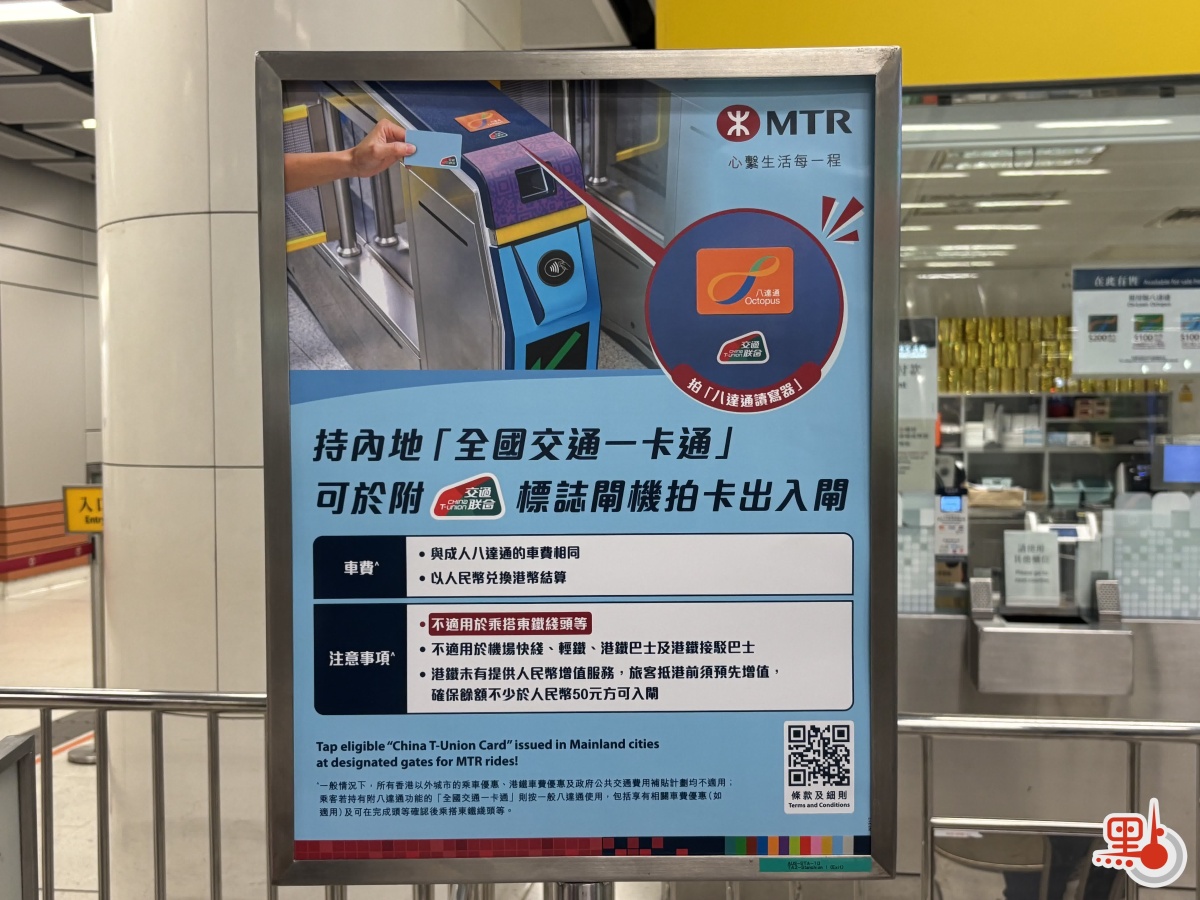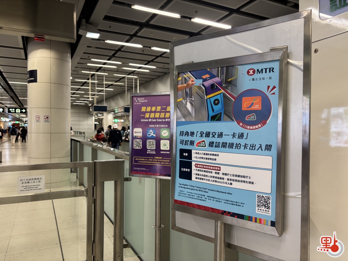 記者走訪部分港鐵車站,發現許多車站都設有至少兩部配備「全國通」支付功能的閘機。這些閘機均貼有「交通聯合」標誌,乘客只需將「全國通」拍在閘機上的八達通讀寫器上,即可輕鬆進出站。
